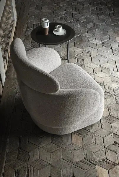La poltrona รจ proposta con rivestimento in tessuto Ricciolone, una finitura materica e piacevole al tatto che valorizza ulteriormente il design. La base girevole aumenta la funzionalitร , rendendo Sobi ideale sia per momenti di relax sia per la conversazione.