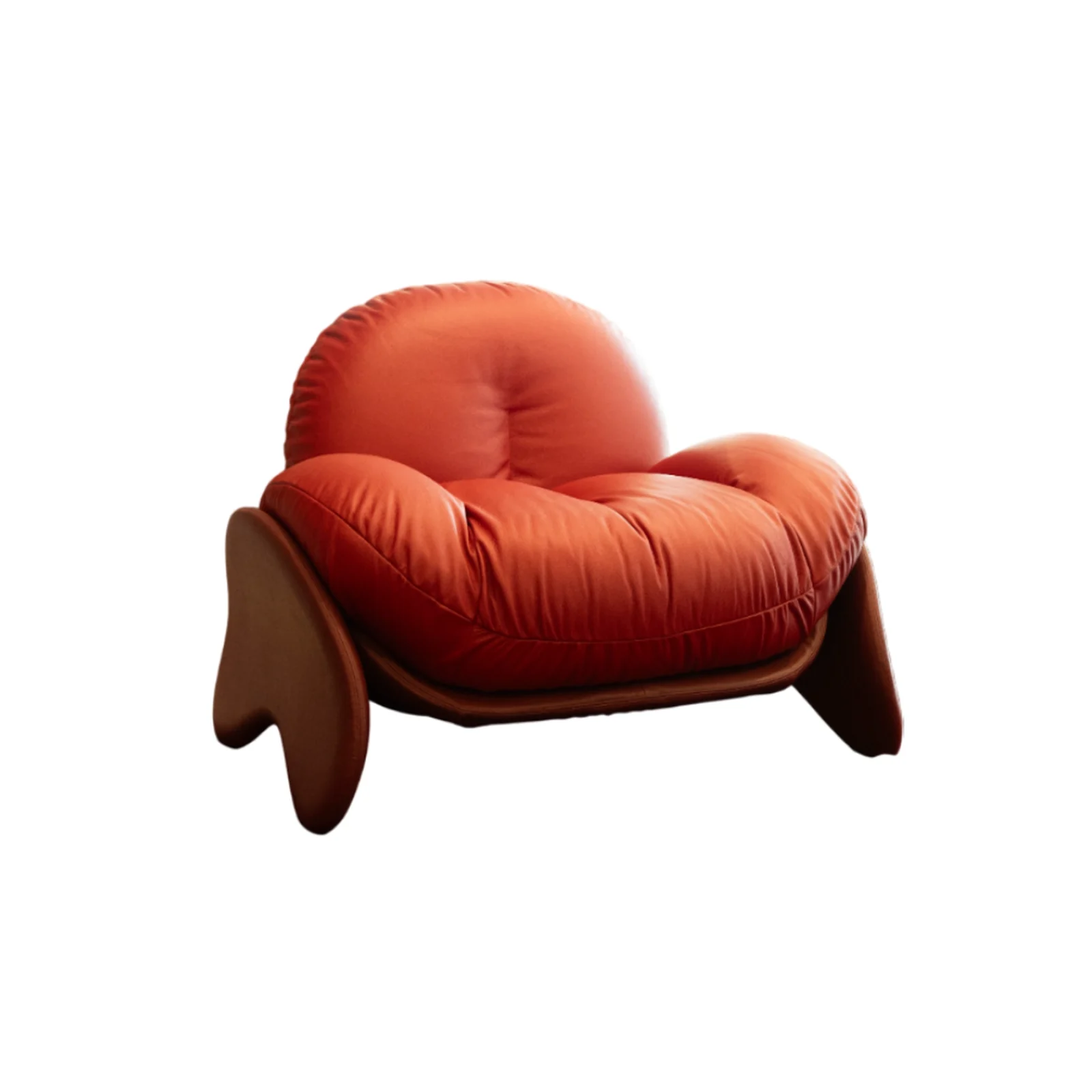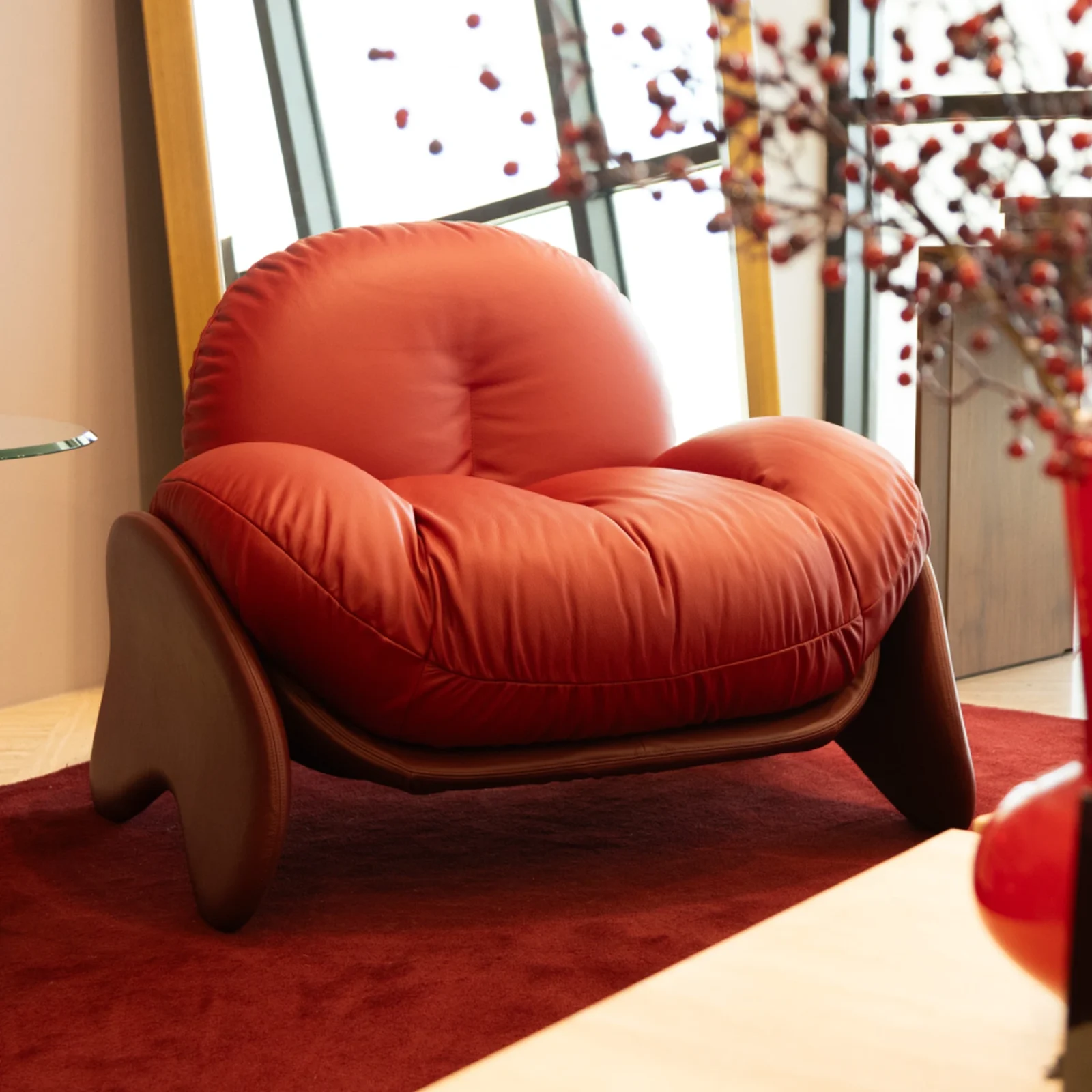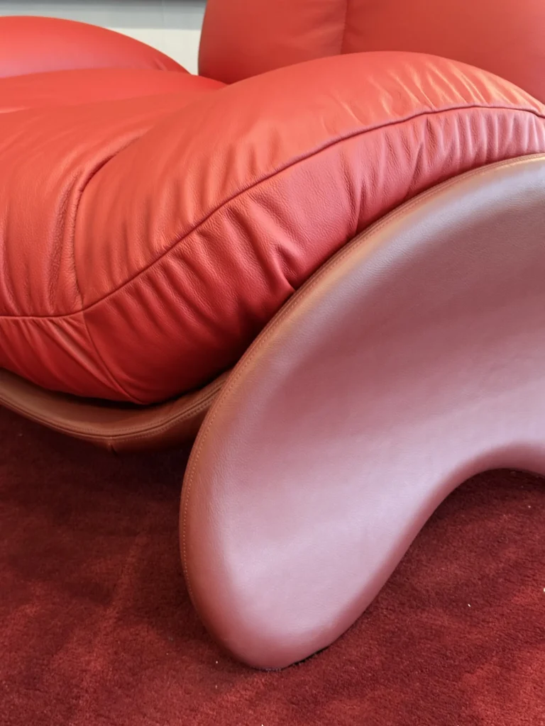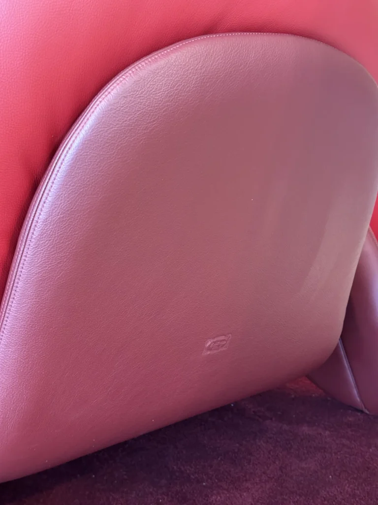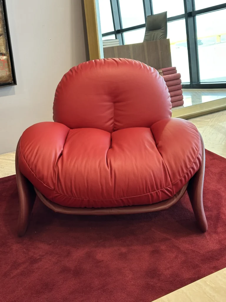 - Rivestimento: Il rivestimento della poltrona รจ disponibile in Pelle Frauยฎ SC 92 Garnet, con un cuscino in Pelle SC 128 Carminio che aggiunge un contrasto elegante.