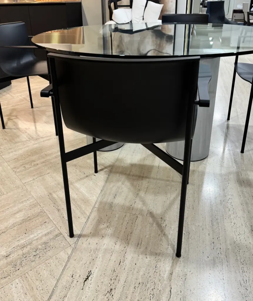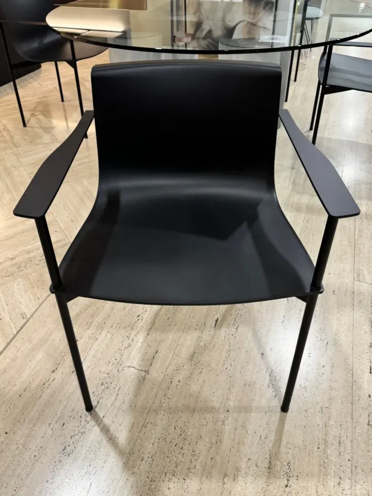La sedia Ombra con braccioli, progettata da Piero Lissoni per Lema, esprime un design minimalista e rigoroso, incarnando la discrezione e l'eleganza tipiche del brand. Caratterizzata da una struttura in metallo verniciato nero che conferisce leggerezza visiva e soliditร  funzionale, la sedia Ombra presenta una scocca in polipropilene rigido, realizzata con uno spessore minimo per un aspetto essenziale.