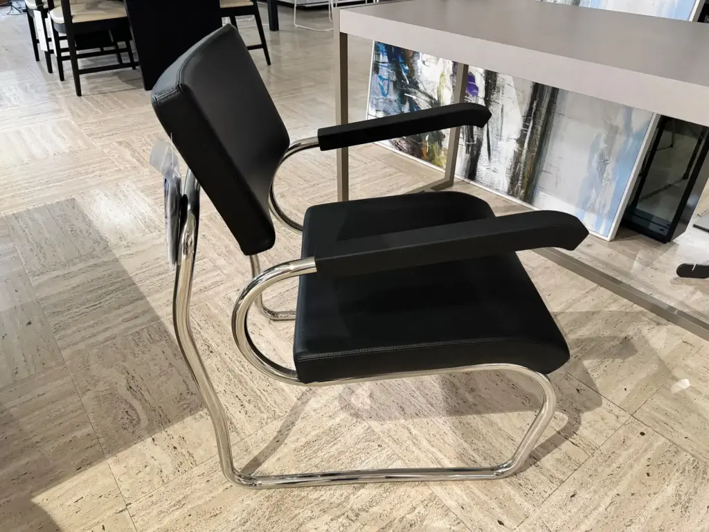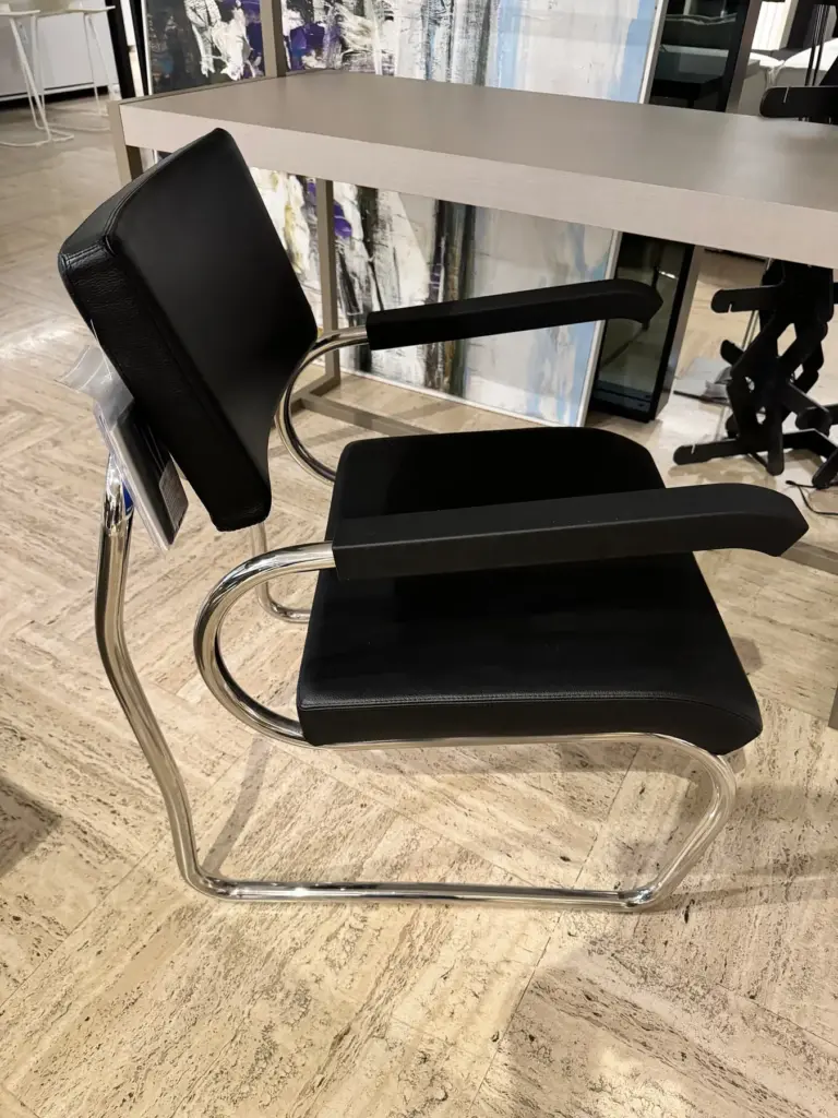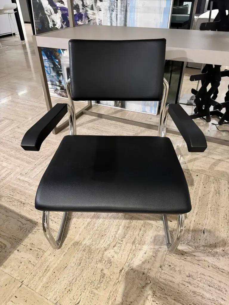 La poltroncina Sant'Elia รจ costruita su un telaio cantilever unico e sinuoso, realizzato in acciaio inox 18/8 cromato. Questo unico tubo d'acciaio, curvato con precisione, sostiene l'intera struttura della poltroncina, inclusi il sedile, lo schienale e i braccioli. Il design a sbalzo del telaio non solo offre una silhouette elegante e moderna, ma conferisce anche una flessibilitร insolita e un comfort eccezionale, unendo bellezza e funzione in un unico oggetto. Il rivestimento della poltroncina รจ disponibile in pelle di alta qualitร , che avvolge il sedile, lo schienale e i braccioli, offrendo un contrasto ricco e sofisticato con il telaio in acciaio lucido. Originariamente chiamata sedia Benita, la poltroncina fu ribattezzata Sant'Elia per evitare associazioni dirette con il regime fascista. Il nome "Sant'Elia" si ispira all'architetto e pittore futurista Antonio Sant'Elia, noto per le sue visioni urbane futuristiche. La poltroncina รจ un'evoluzione della sedia Lariana, un altro prototipo di Terragni caratterizzato da un telaio a sbalzo e un design innovativo per l'epoca. Per la sala del Consiglio di amministrazione della Casa del Fascio, Terragni sviluppรฒ ulteriormente il design della Lariana, prolungando il telaio per creare braccioli eleganti e solidi, dando vita alla sedia Benita.
