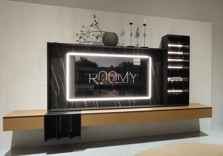 - Illuminazione LED: LED incassati nei sottili spessori dei ripiani e schiena con LED creano una luce soffusa e scenografica, regolabile tramite dimmer a 220V e radiocomando a 4 canali.