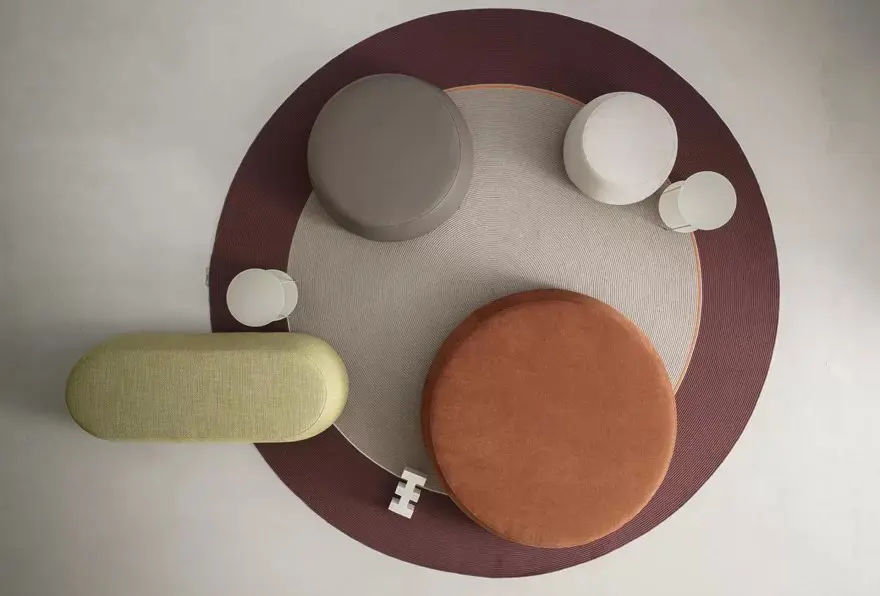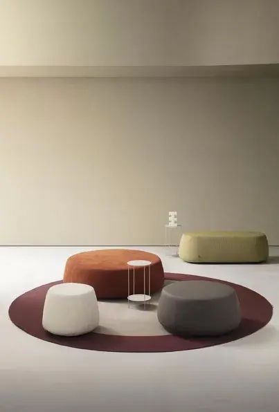 Il rivestimento in tessuto Fenkรจ, codice colore 500, aggiunge un tocco materico raffinato. Questa finitura valorizza il design del pouf e ne sottolinea il carattere moderno e accogliente.