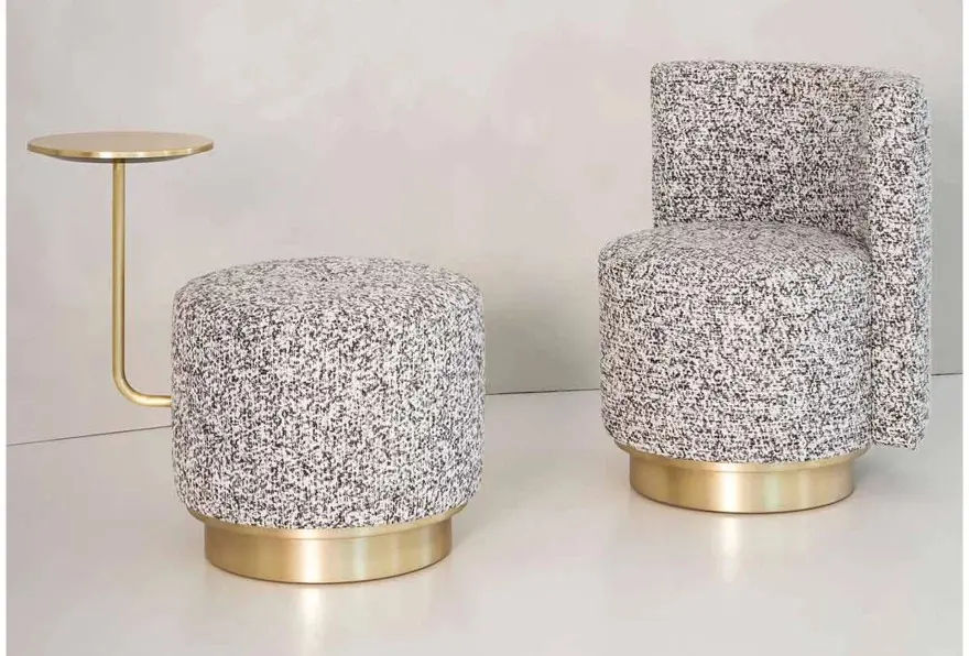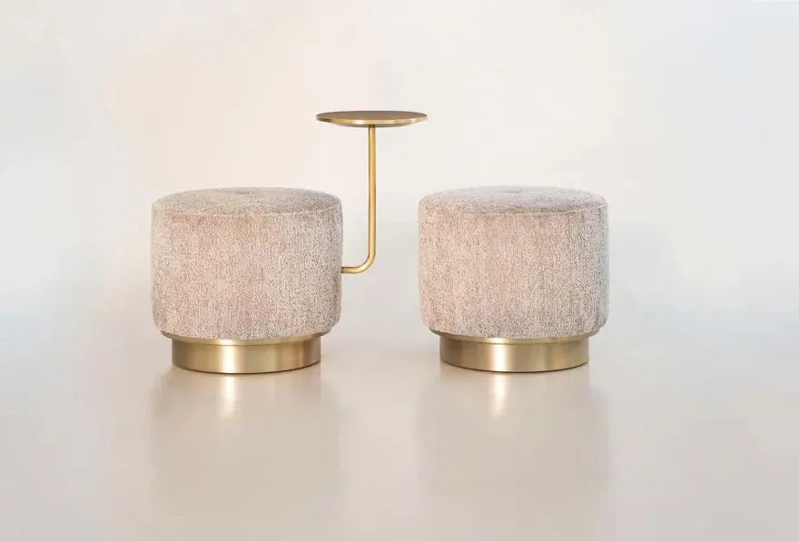 La collezione Harry propone diverse configurazioni, che spaziano dal pouf tradizionale fino alla versione più funzionale con tavolino integrato, ideale come piano d’appoggio accanto a divani e poltrone. In questa variante, il pouf è rifinito in tessuto Orsetto cod. 01/2, abbinato a dettagli e tavolino in ottone satinato, per un equilibrio perfetto tra morbidezza e accenti metallici.