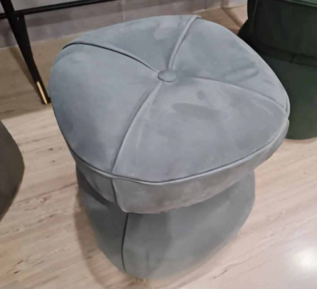 - Rivestimento: Il pouf è rivestito in Velvety Grey Salt, un tessuto morbido, che aggiunge eleganza e versatilità al prodotto. Nella versione in tessuto, la lavorazione di piegatura è sostituita da una cucitura, che conferisce un aspetto pulito e lineare.