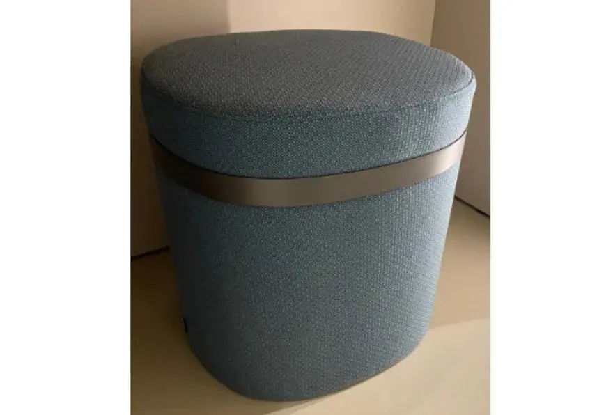 La struttura imbottita รจ rivestita in tessuto Iris Oceano, codice colore 703, una tonalitร profonda e sofisticata che valorizza ambienti living moderni ed eleganti. Inoltre, il vassoio superiore con finitura Nickel introduce un contrasto materico deciso, rendendo il pouf funzionale anche come piano dโappoggio.