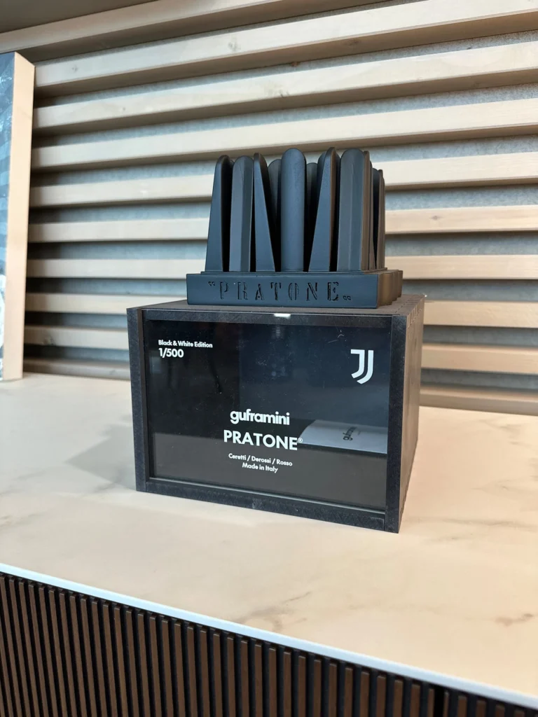Disegnato originariamente da Ceretti, Derossi e Rosso, il Pratone รจ un simbolo pop degli anni '70, caratterizzato dai suoi 42 morbidi steli che si orientano in direzioni diverse, creando un effetto visivo di gioco e movimento. La versione Black & White Edition mantiene la struttura iconica del Pratone, ma viene declinata in una scala ridotta 1:8, rendendola un pezzo da collezione perfetto per gli appassionati di design e di calcio. Rifinito a mano e prodotto interamente in Italia, il Pratone Guframini Black & White Edition รจ una perfetta replica dellโoriginale, ogni pezzo รจ numerato, sottolineando lโesclusivitร di questa collezione che combina il mondo del design d'avanguardia con lโestetica sportiva.