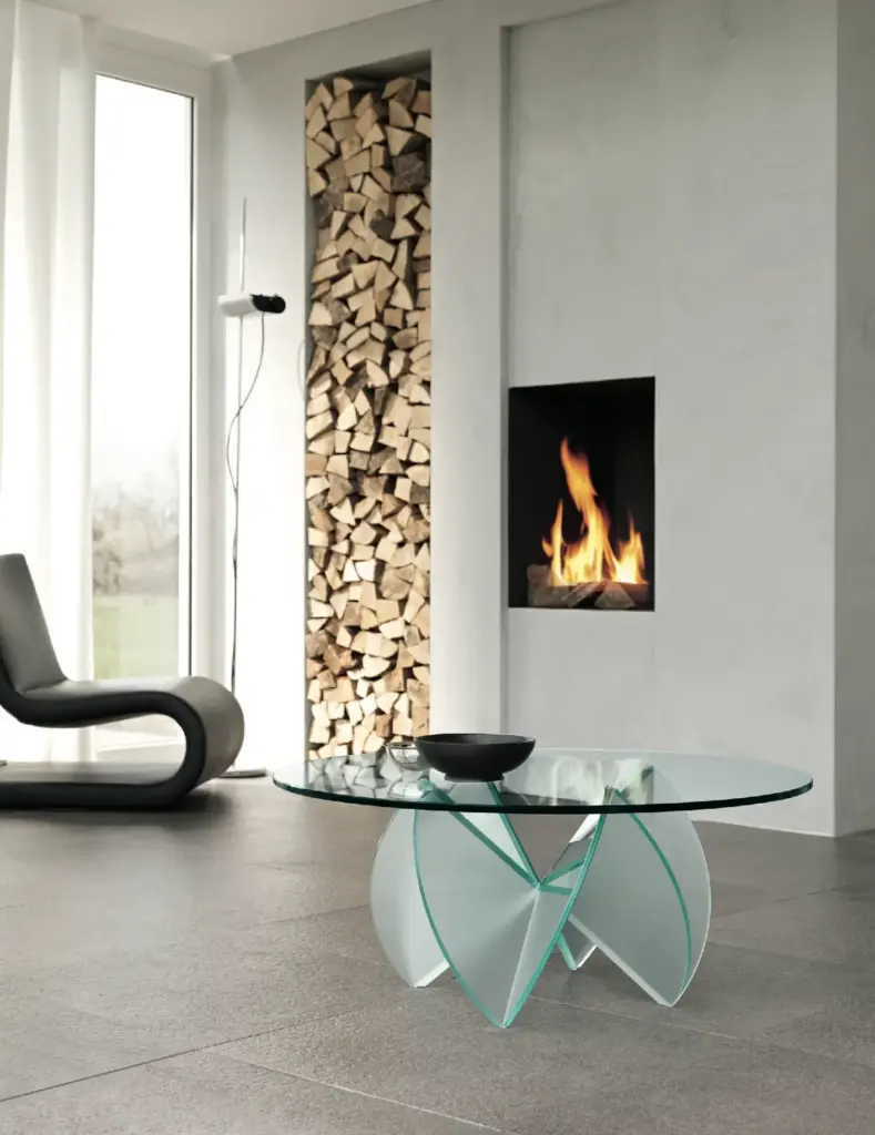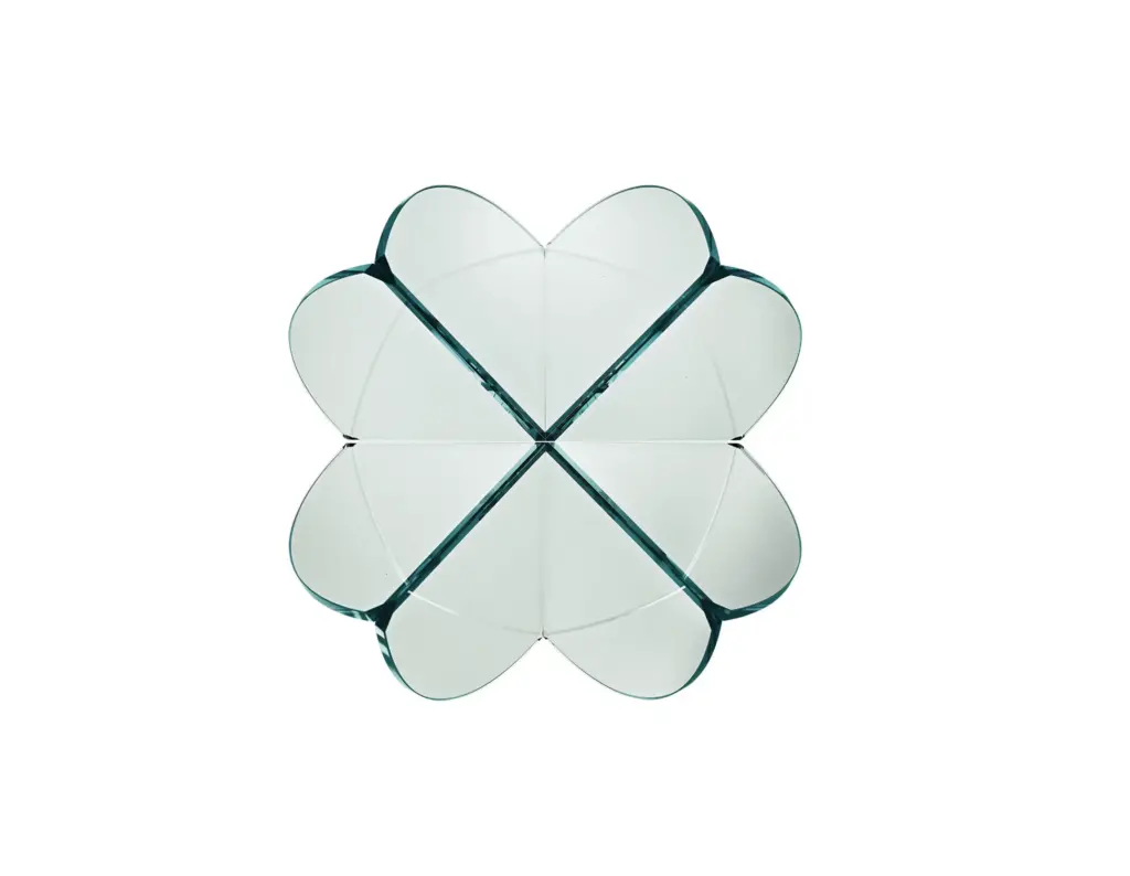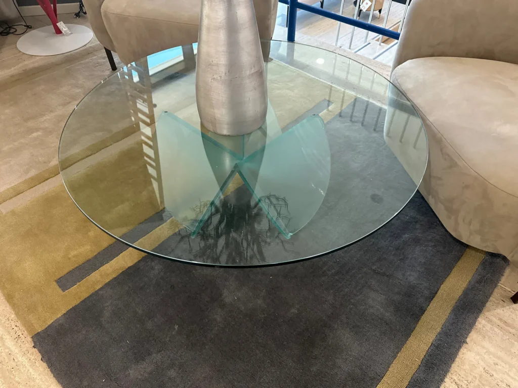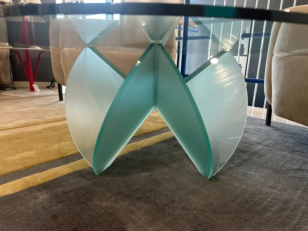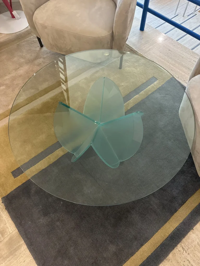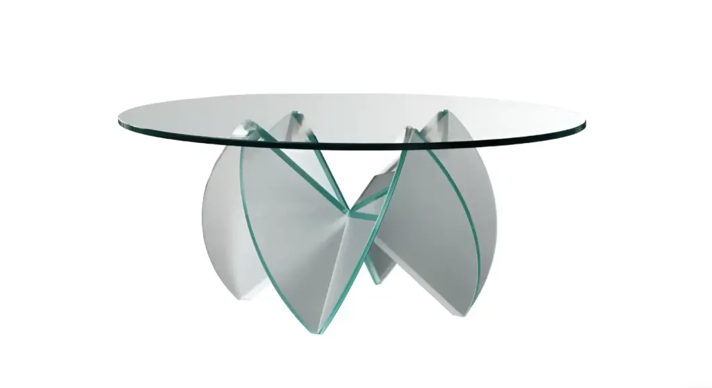 La base del tavolino, formata da due elementi in vetro che si intersecano, evoca l'immagine di una rosa del deserto, aggiungendo un tocco artistico a qualsiasi ambiente. Il piano rotondo รจ realizzato in vetro temperato trasparente con bordi arrotondati, mentre la base puรฒ essere scelta in vetro acidato o trasparente, a seconda delle preferenze estetiche. Perfetto per ambienti moderni o classici, questo tavolino aggiunge un tocco di originalitร .