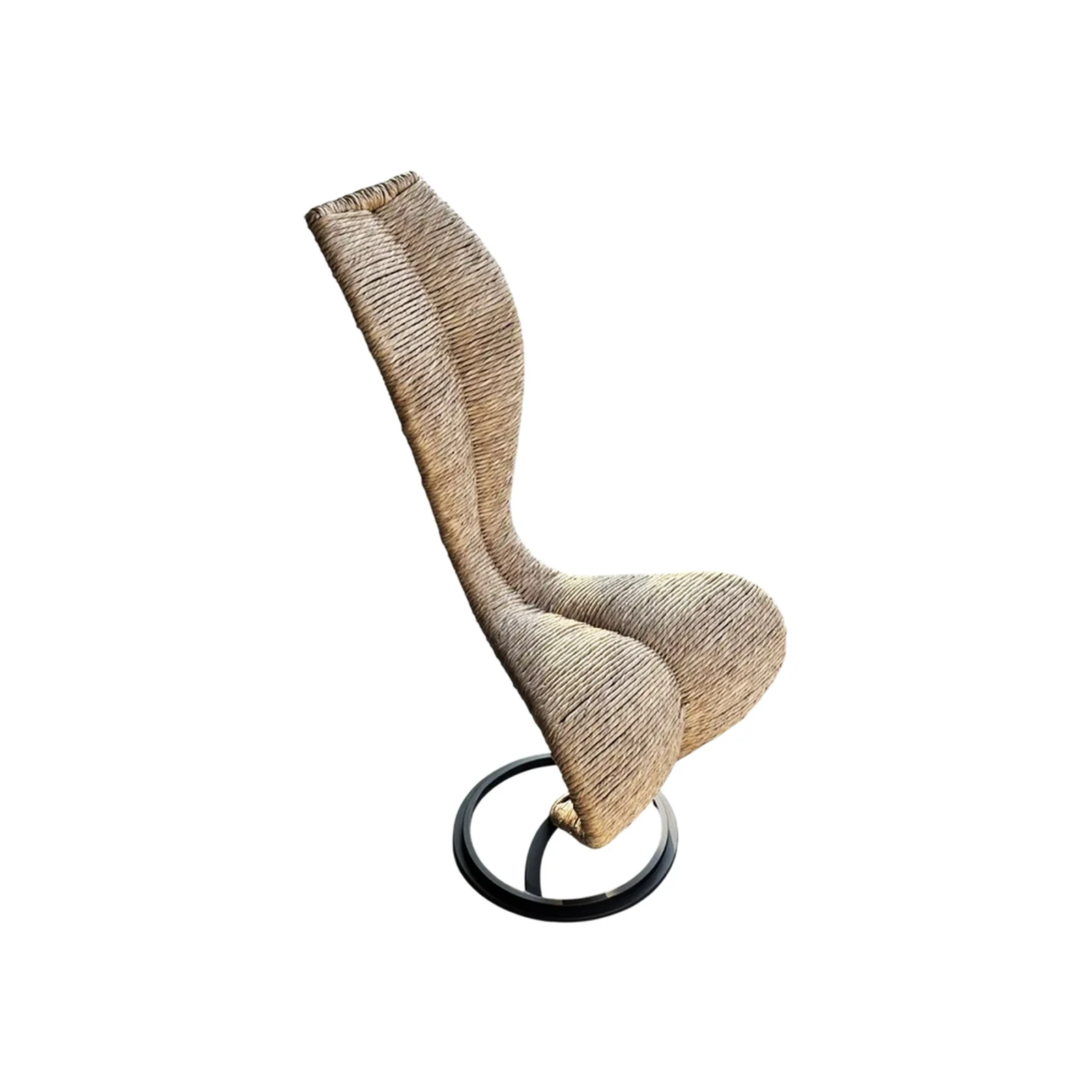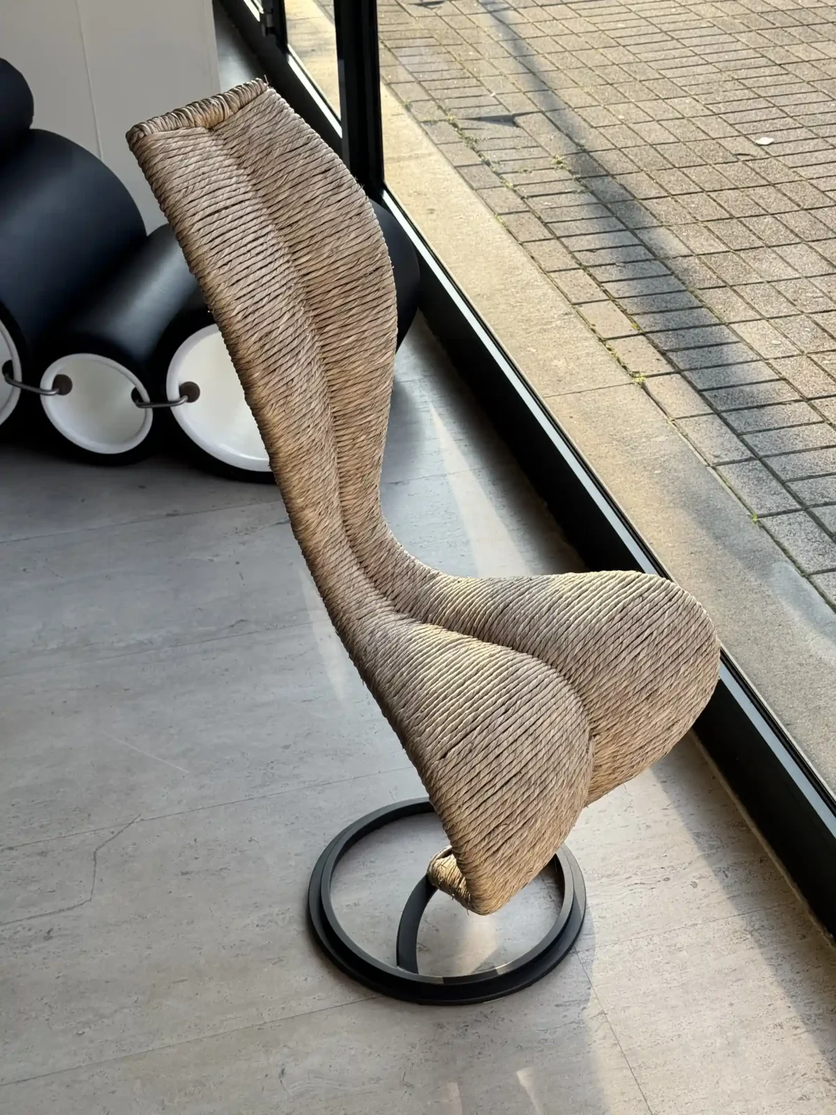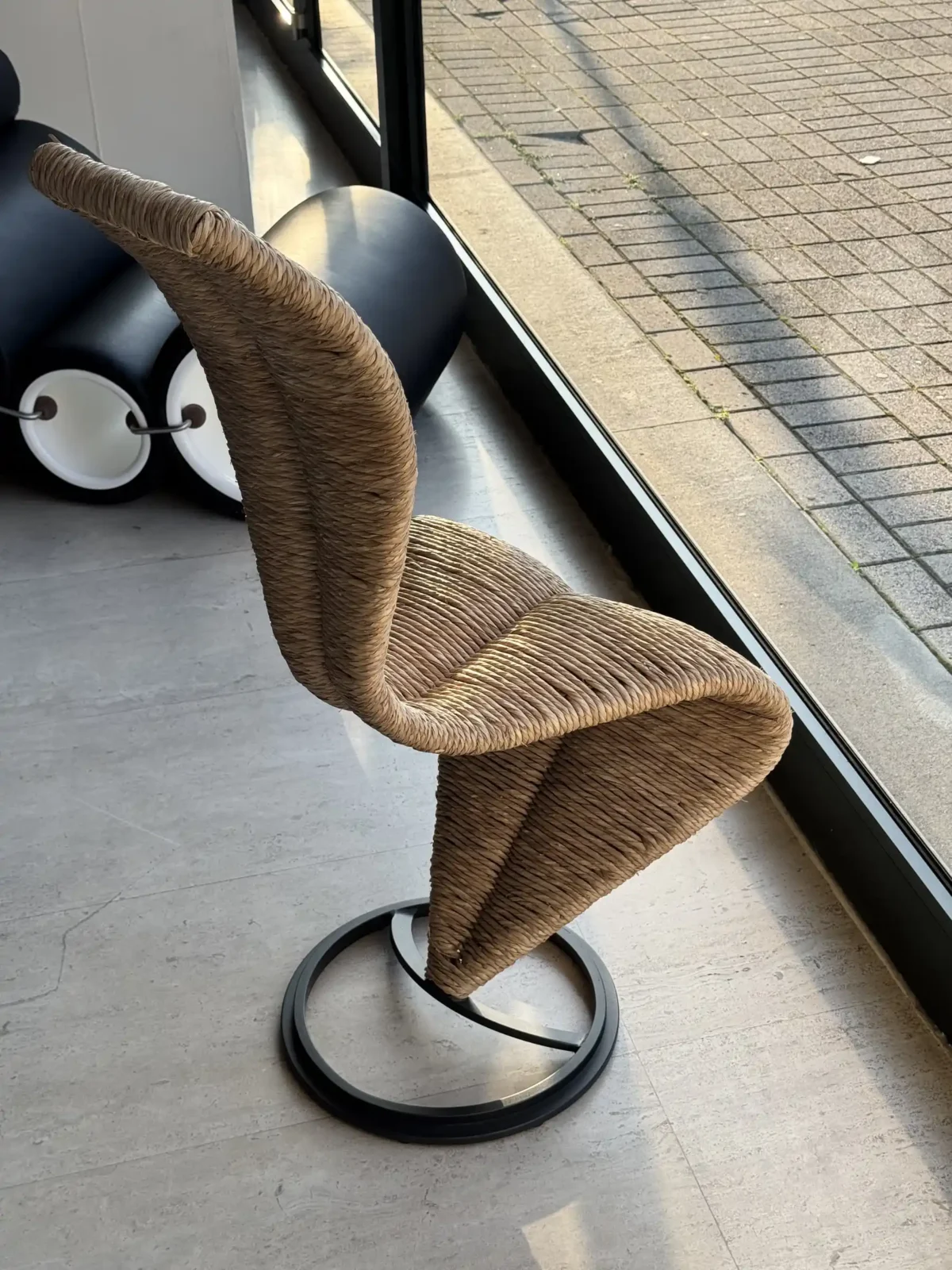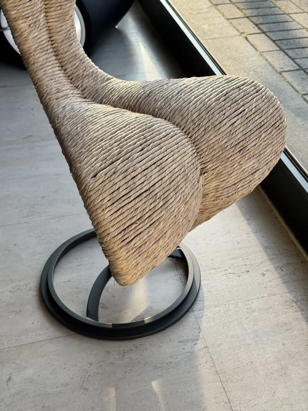 Disegnata nel 1992 da Tom Dixon, questa sedia si distingue per la sua forma sinuosa e naturale, che si sviluppa verticalmente su una piccola base. La struttura in metallo verniciato scuro si armonizza perfettamente con il rivestimento in paglia di palude, creando un contrasto sofisticato tra materiali tradizionali e moderni.
