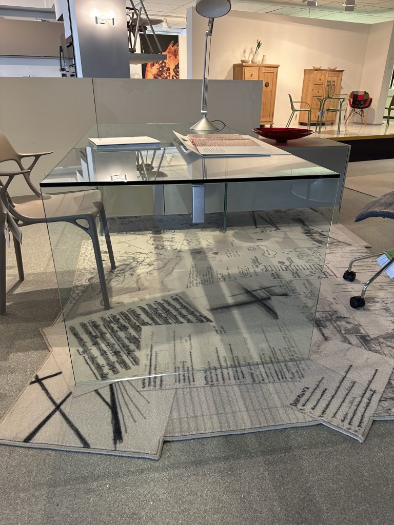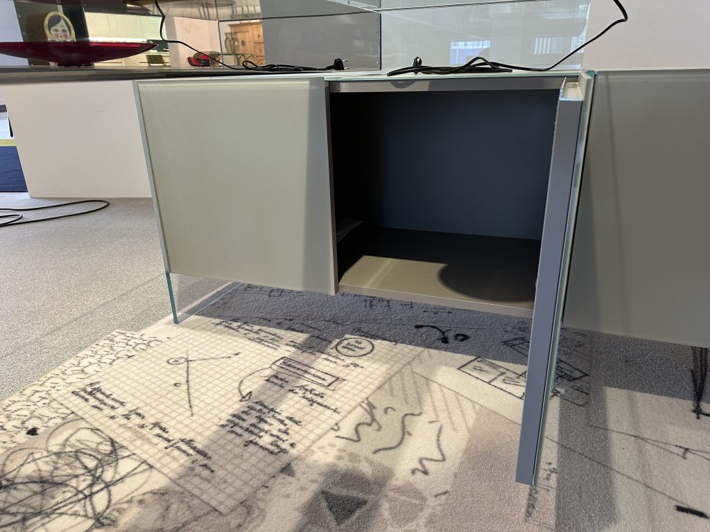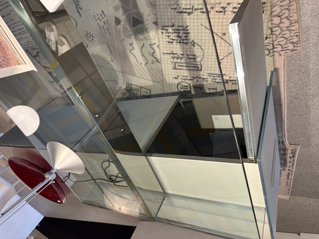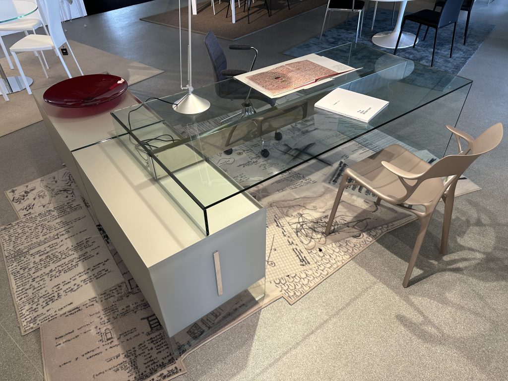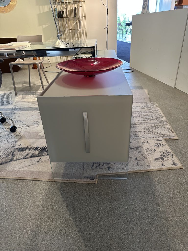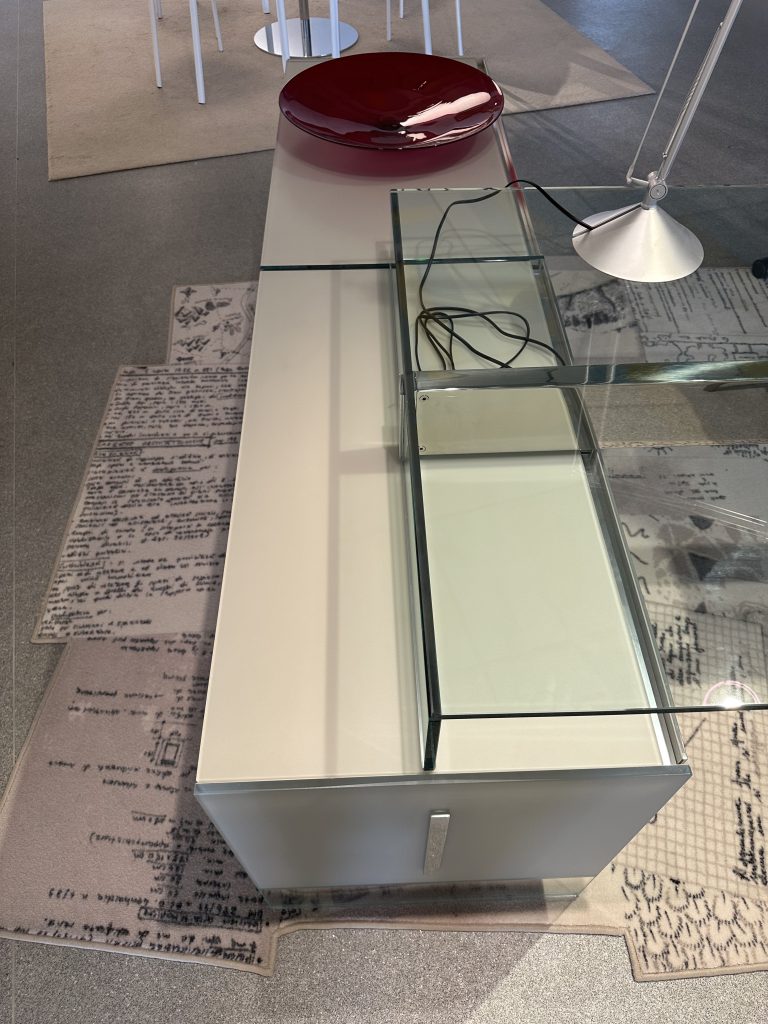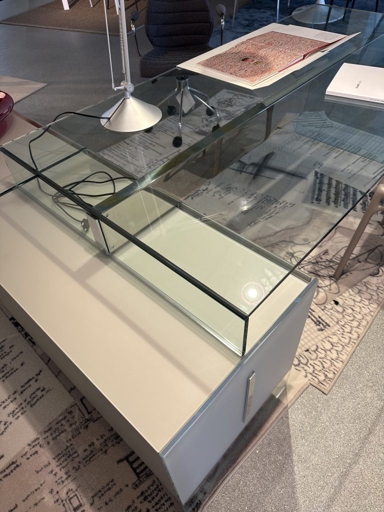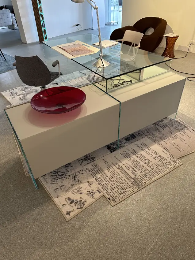Air Desk รจ arricchita da un contenitore laterale "Dattilo" con un cassettone e un contenitore con due ante in vetro satinato champagne. Il top della scrivania รจ in cristallo trasparente, mentre la trave di sostegno รจ realizzata in acciaio inox lucido. Un elegante complemento d'arredo per uffici o spazi di lavoro, progettato da Gianni Borgonovo.
