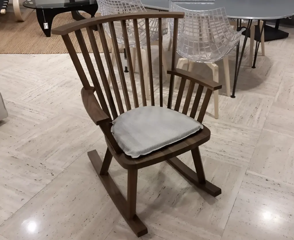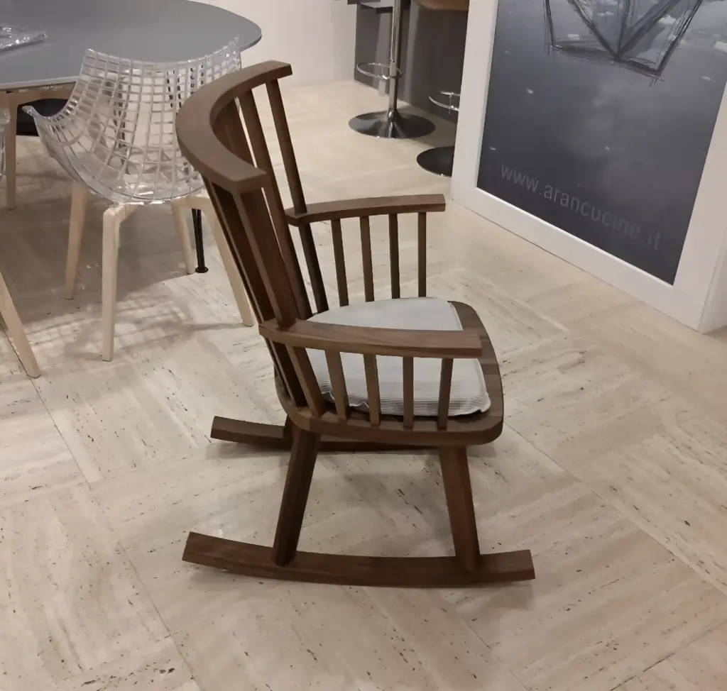 La sedia a dondolo Gray 29, realizzata in legno, รจ un connubio perfetto tra linee sinuose e stile classico nordico. Caratterizzata da un schienale a listelli che crea un elegante gioco di pieni e vuoti, la struttura in noce o rovere si contrappone armoniosamente ai morbidi cuscini volanti, che offrono un comfort aggiuntivo.
