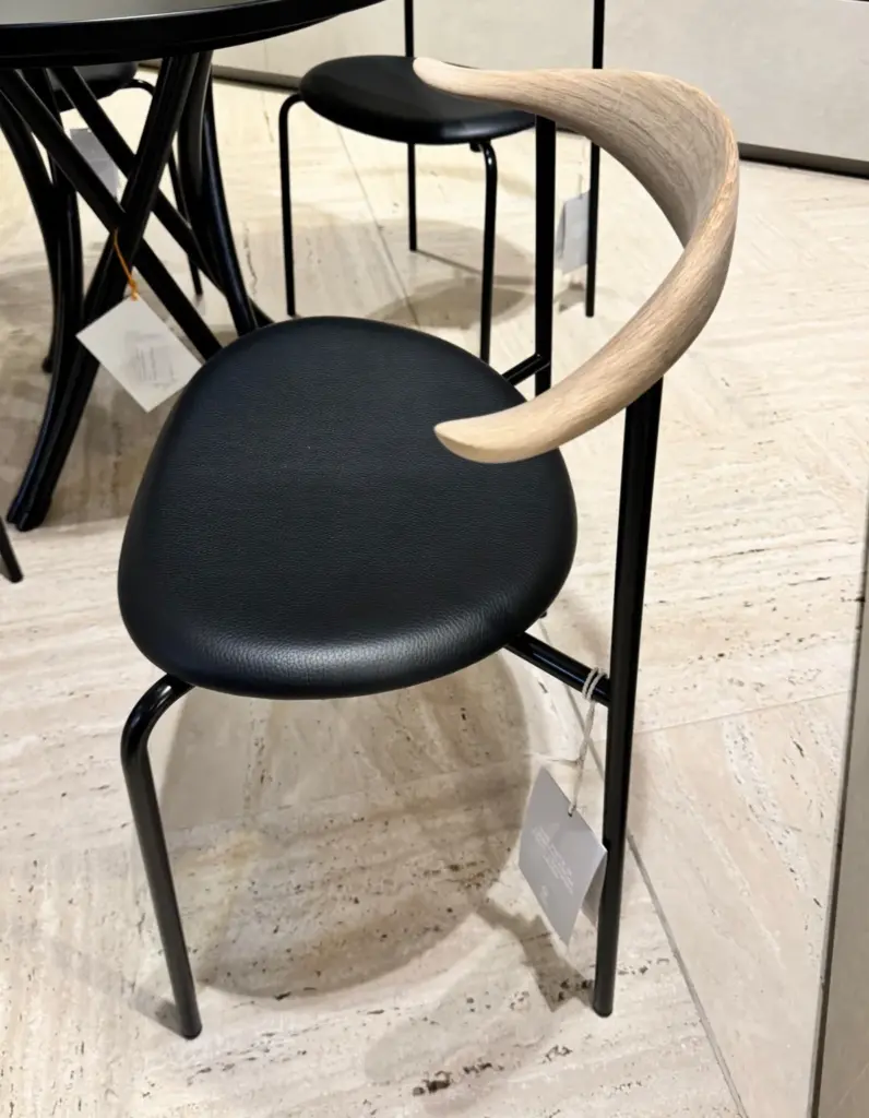 Le gambe in metallo reggono un sottile e sinuoso schienale insieme a una comoda seduta imbottita in pelle nera, rendendola perfettamente impilabile e ideale per ambienti dinamici. La struttura è disponibile in acciaio verniciato nero, conferendo alla sedia un aspetto contemporaneo.