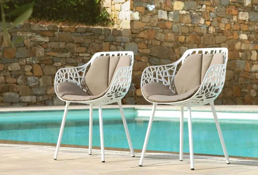 La poltroncina Forest รจ proposta anche nella versione in alluminio verniciato Bianco Burro, una finitura luminosa e raffinata che valorizza gli spazi esterni con discrezione ed eleganza.