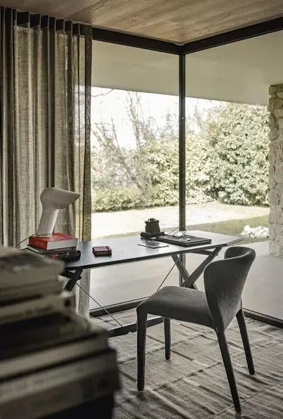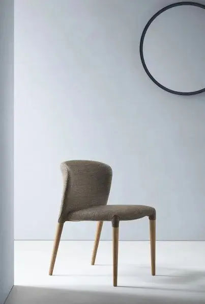 La struttura della sedia รจ pensata come un unico segno fluido. Seduta e schienale si fondono armoniosamente, garantendo comfort e una postura rilassata. Inoltre, le proporzioni leggere contribuiscono a mantenere lo spazio visivamente arioso e ordinato.
