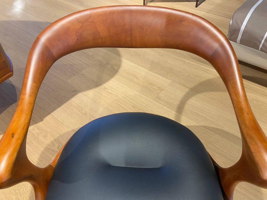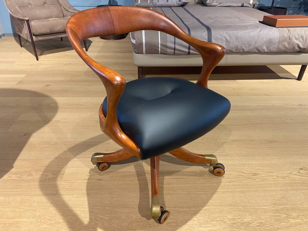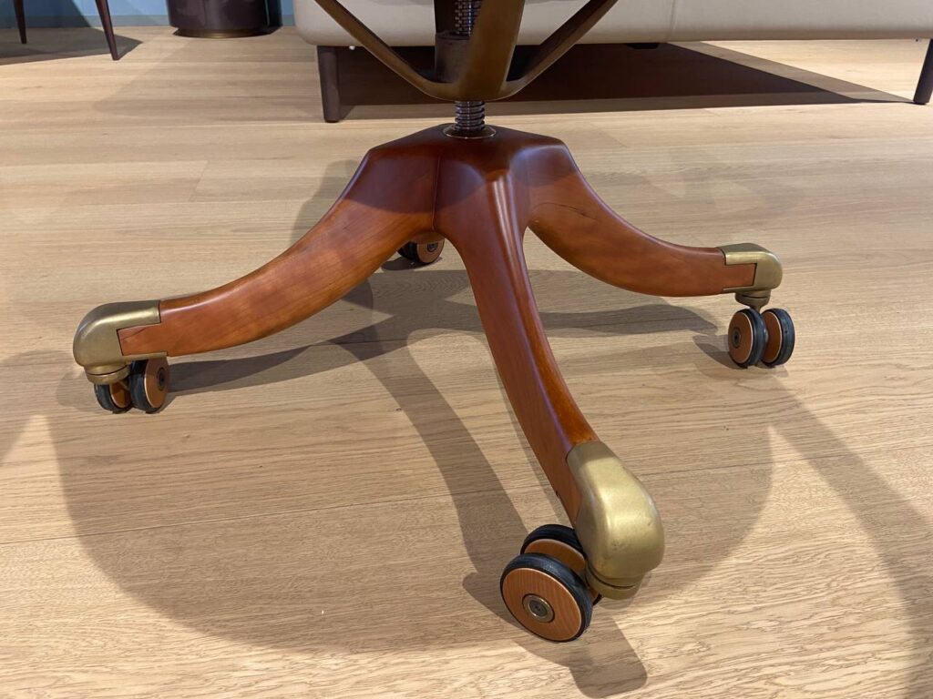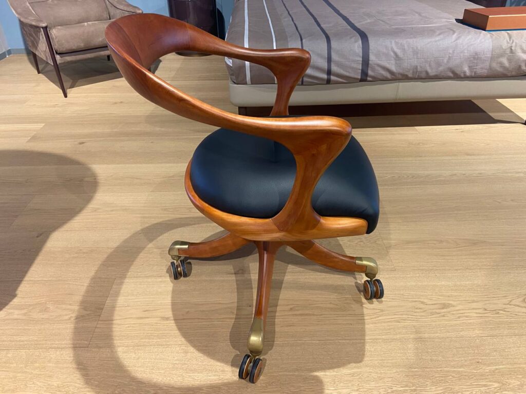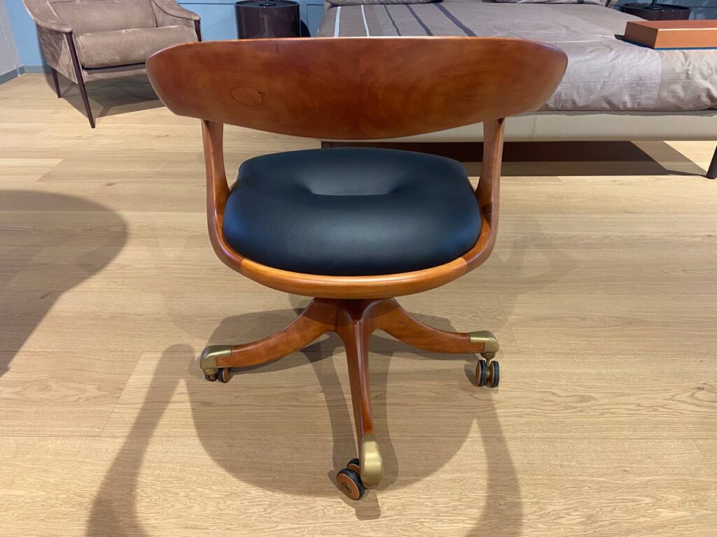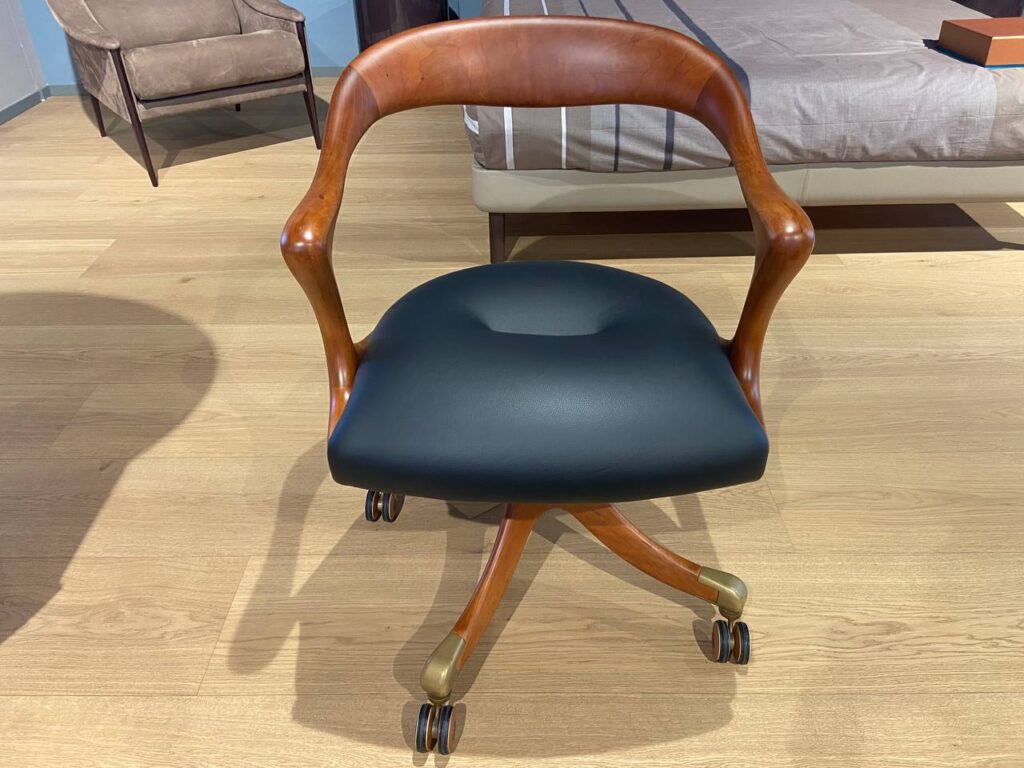 La sedia girevole Marlowe si distingue per il suo design sofisticato e materiali di altissima qualitร . La struttura รจ realizzata in legno massello di ciliegio, valorizzando lโartigianato italiano con dettagli curati e finiture di pregio. La seduta imbottita, rivestita in pelle nera SC, offre comfort e stile senza compromessi, ideale per ambienti di lavoro o zone studio. La base a 4 razze รจ dotata di piedini in ottone e ruote girevoli in legno, che coniugano funzionalitร e eleganza. Marlowe rappresenta una scelta perfetta per chi cerca un oggetto d'arredo esclusivo e dal carattere deciso.