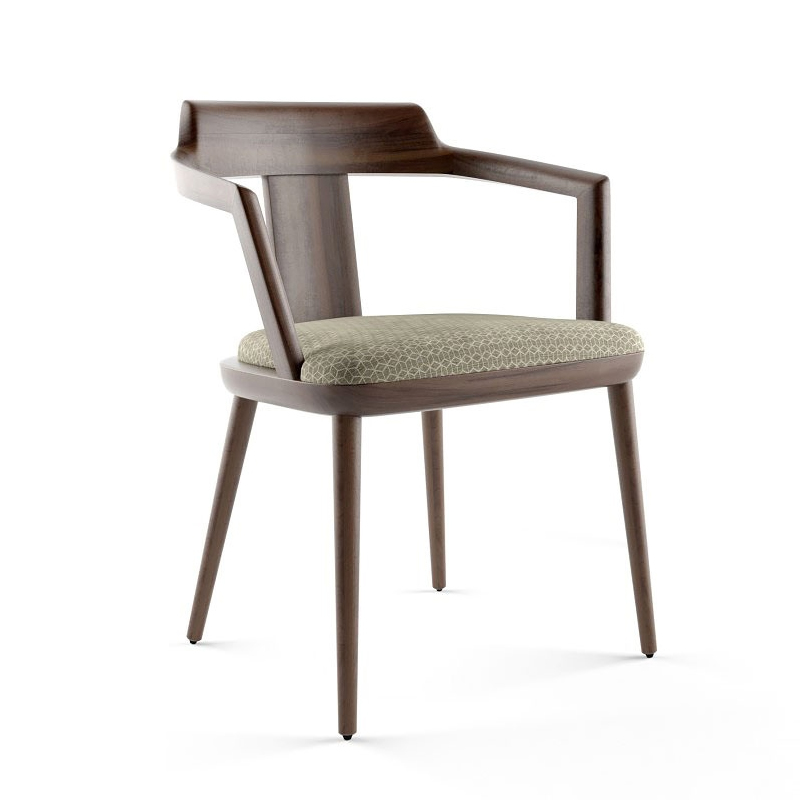 La Sedia Tilly di Porada, disegnata da Carlo Ballabio, รจ un perfetto esempio di equilibrio tra design contemporaneo e maestria artigianale. Realizzata con struttura e braccioli in massello di noce canaletta, si distingue per la sua silhouette raffinata e per la seduta imbottita, rivestita nel tessuto Rabat con motivo geometrico, che aggiunge profonditร e carattere alla composizione.