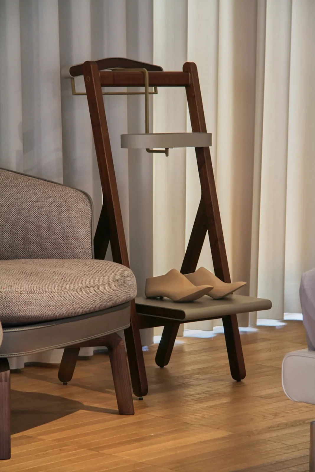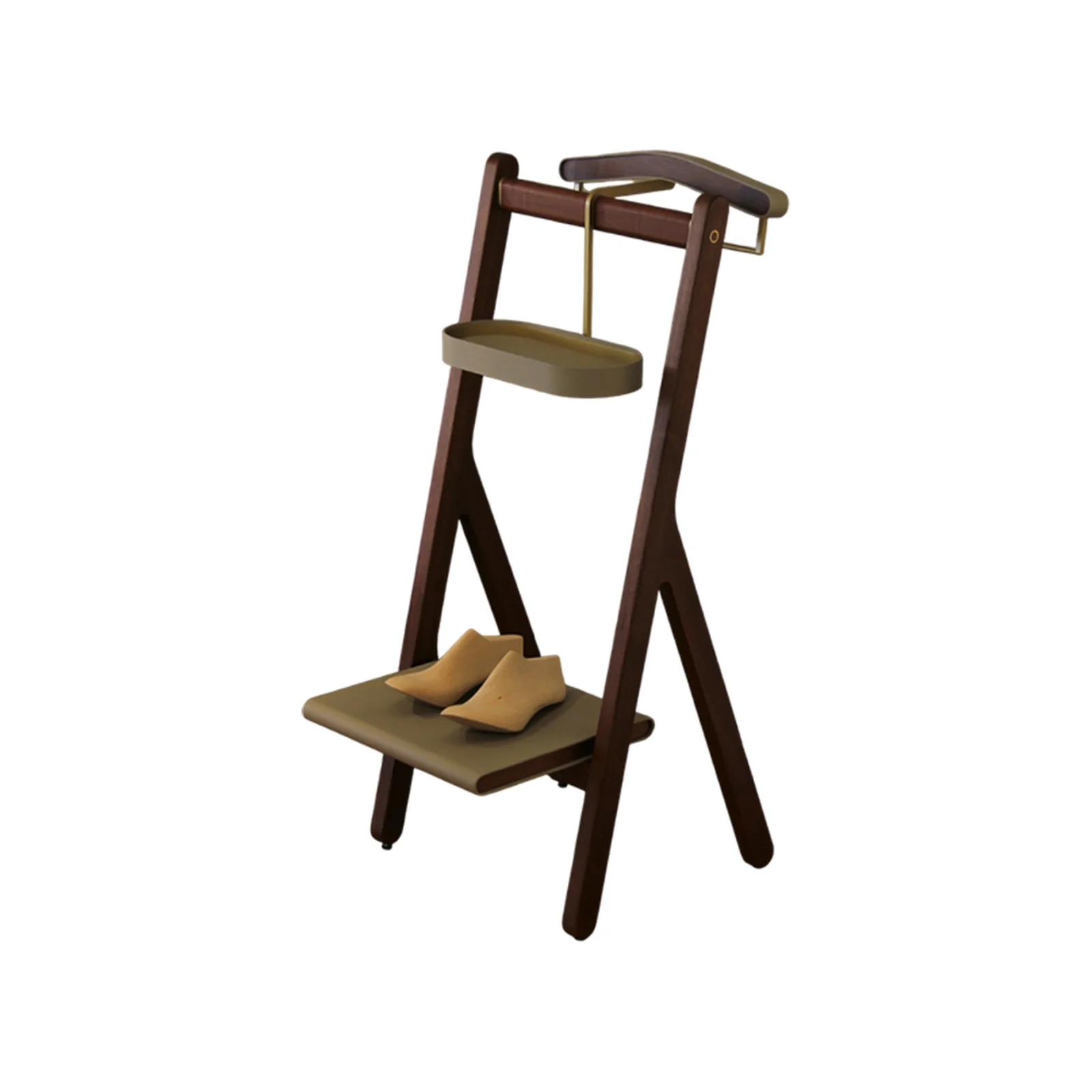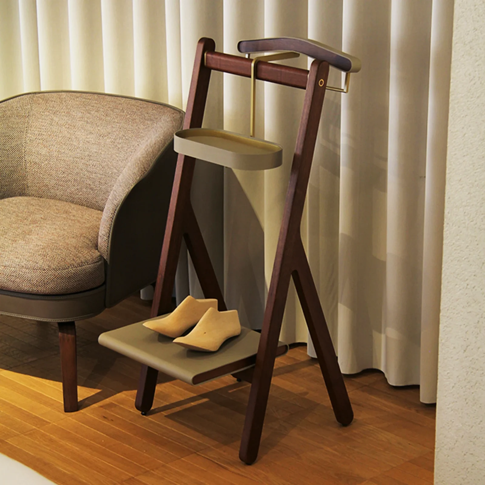 Uno dei pezzi principali della collezione Ren รจ il Servomuto, include una stampella appendiabiti, un vassoio portaoggetti ovale e un ripiano inferiore. La stampella รจ realizzata in multistrato di betulla impiallacciato noce canaletto, valorizzata da una fascia in cuoio Saddle Extra. Il vassoio, perfetto per riporre piccoli oggetti, ha una base in multistrato di betulla e una cornice in ottone rivestita in cuoio, mentre il ripiano inferiore completa lโ€™estetica e la funzionalitร  del Servomuto.