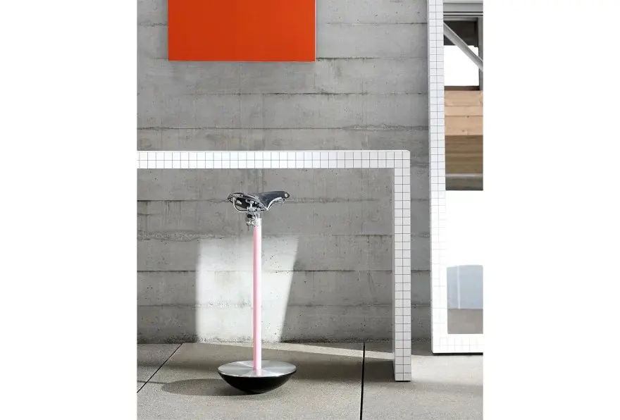 Il prodotto รจ composto da una sella da bici da corsa nera, unโ€™asta in acciaio verniciato rosa e un basamento in ghisa fusa, materiali scelti per garantire stabilitร , resistenza e un forte impatto visivo. Una seduta scultorea, ideale come pezzo statement in ambienti contemporanei o collezioni di design.