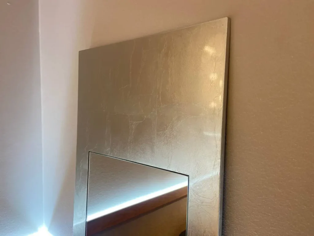 Questo specchio presenta una cornice in legno rivestita in foglia dโargento che ne esalta lโeleganza. La caratteristica distintiva รจ l'asimmetria... Leggi di piรน