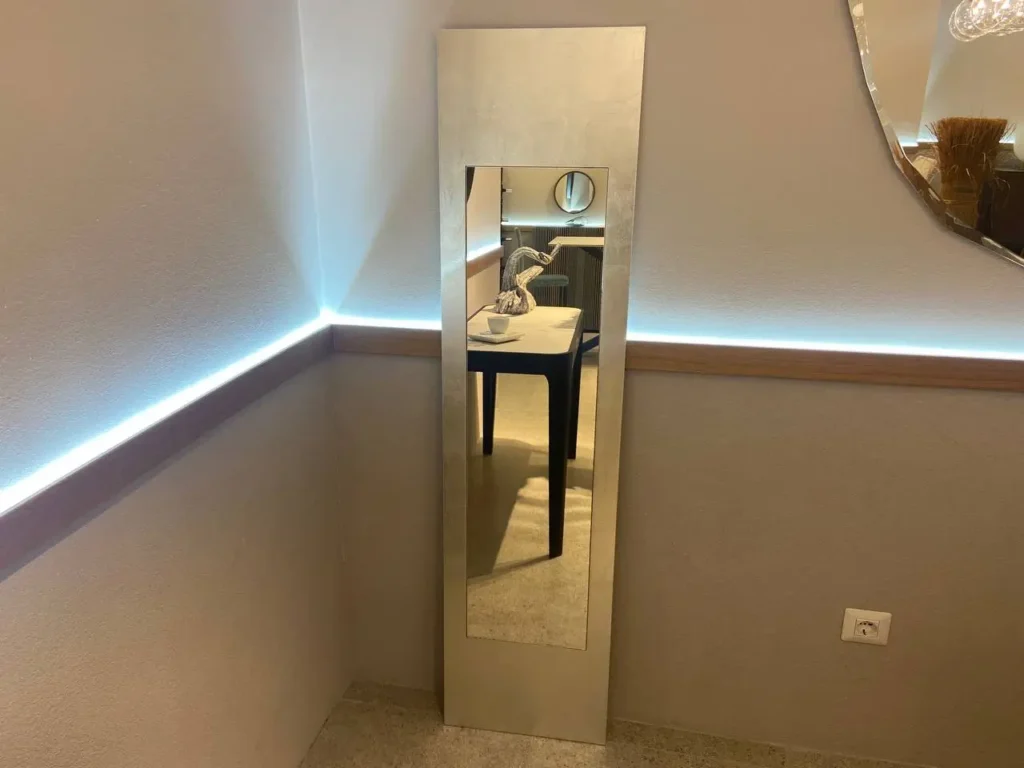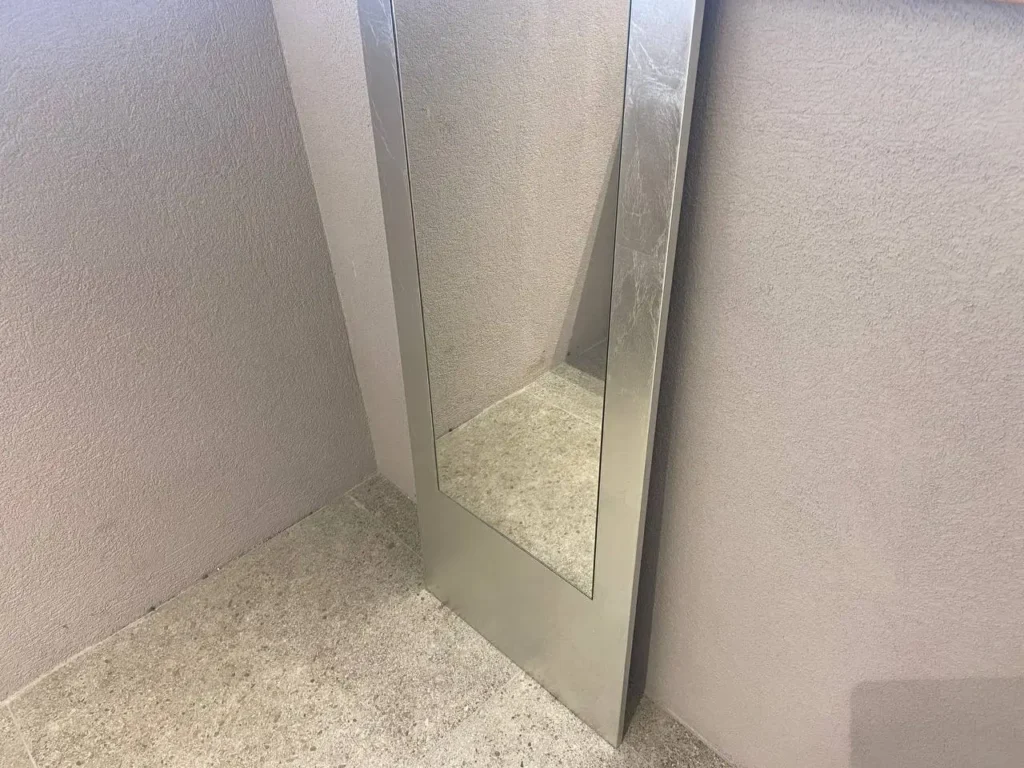 Questo specchio presenta una cornice in legno rivestita in foglia dโargento che ne esalta lโeleganza. La caratteristica distintiva รจ l'asimmetria della superficie riflettente rispetto alla cornice, un dettaglio che lo rende unico. Questo specchio puรฒ essere montato sia in orientamento verticale che orizzontale, adattandosi a diverse esigenze di spazio e design, perfetto per arricchire con stile e personalitร ambienti moderni e classici. Contatta il nostro team di esperti via email aย info@primearredo.comย o chiamaci per maggiori informazioni!