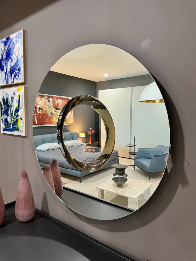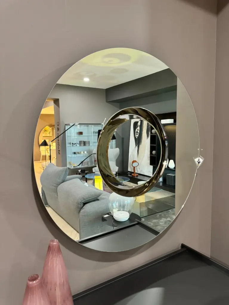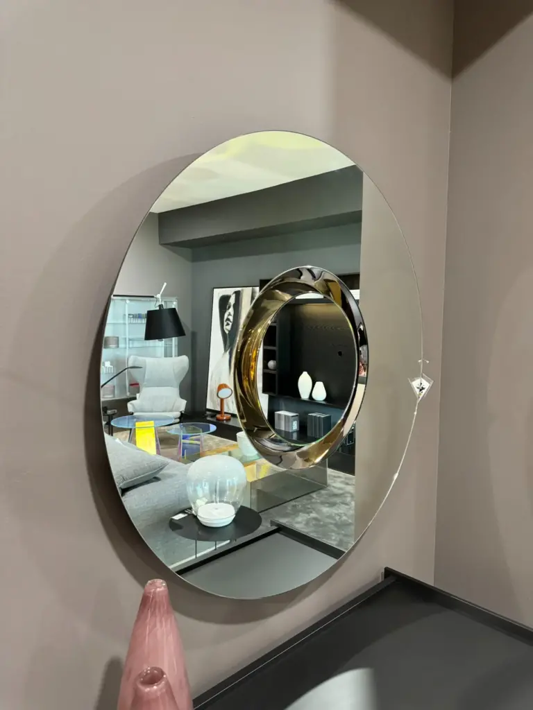 Lo specchio Ozma, disegnato da Viola Tonucci, รจ un complemento d'arredo perfetto per arricchire la sala da pranzo o la zona living. Con la sua forma circolare e concentrica, questo specchio non solo aggiunge luminositร all'ambiente, ma offre anche un tocco di originalitร grazie alla sua caratteristica unica: una parte dello specchio รจ estraibile e puรฒ essere utilizzata come centrotavola.