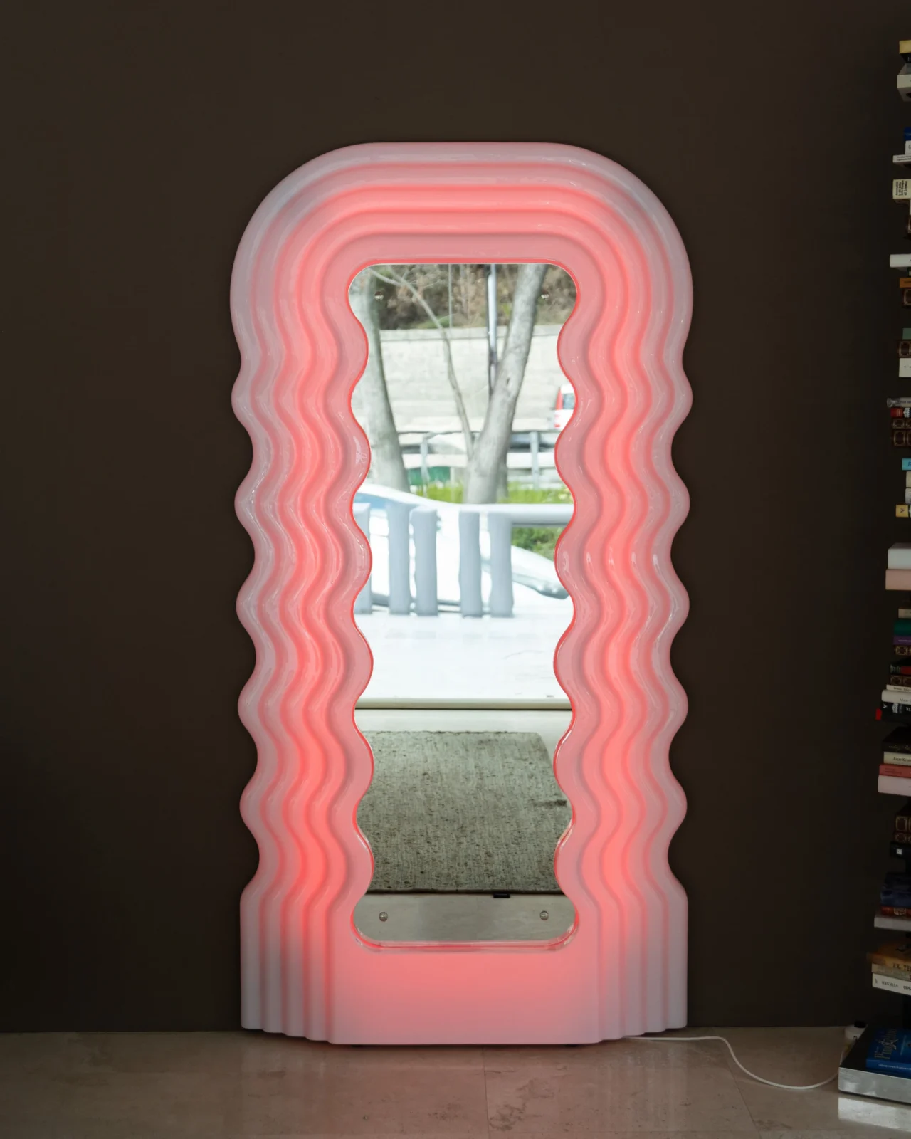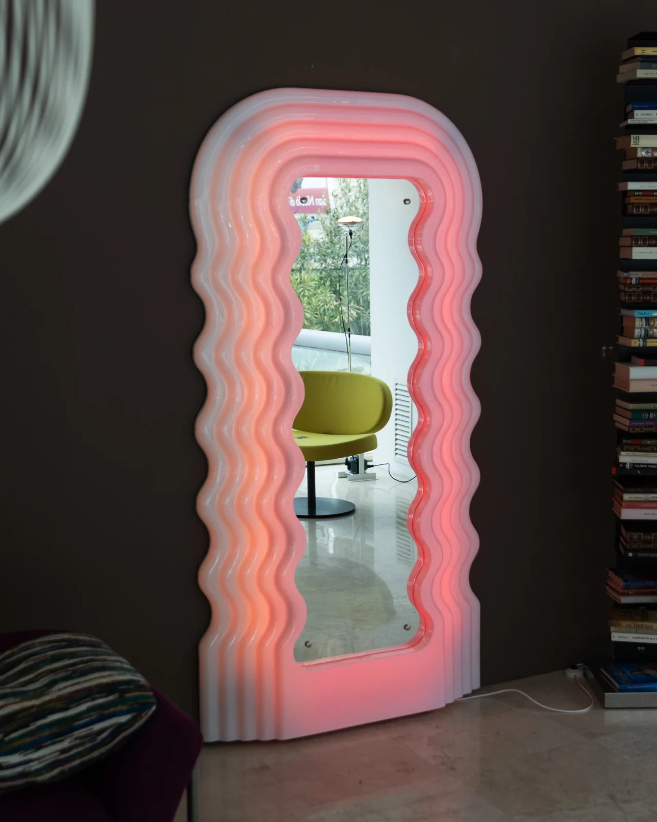 • Materiale: La cornice รจ termoformata in materiale plastico opalino traslucido che emana una luce rosa, creando un'atmosfera calda e avvolgente. Il retro รจ rifinito a mano, e ogni specchio รจ certificato con un codice numerico univoco che ne attesta lโ€™autenticitร  e la provenienza made in Italy.