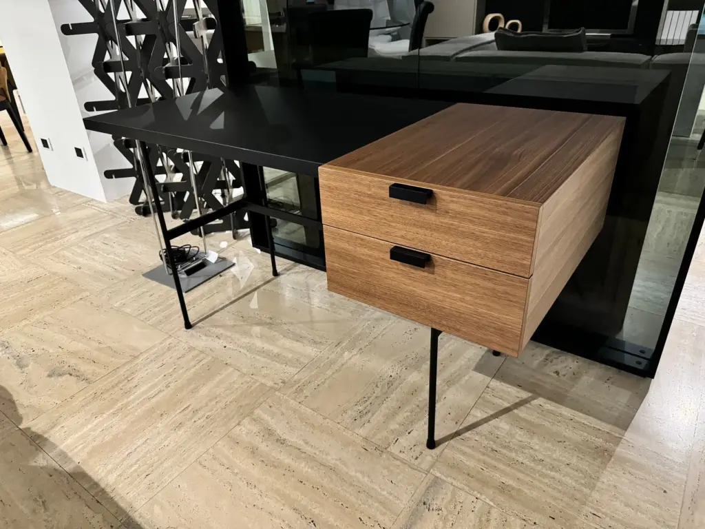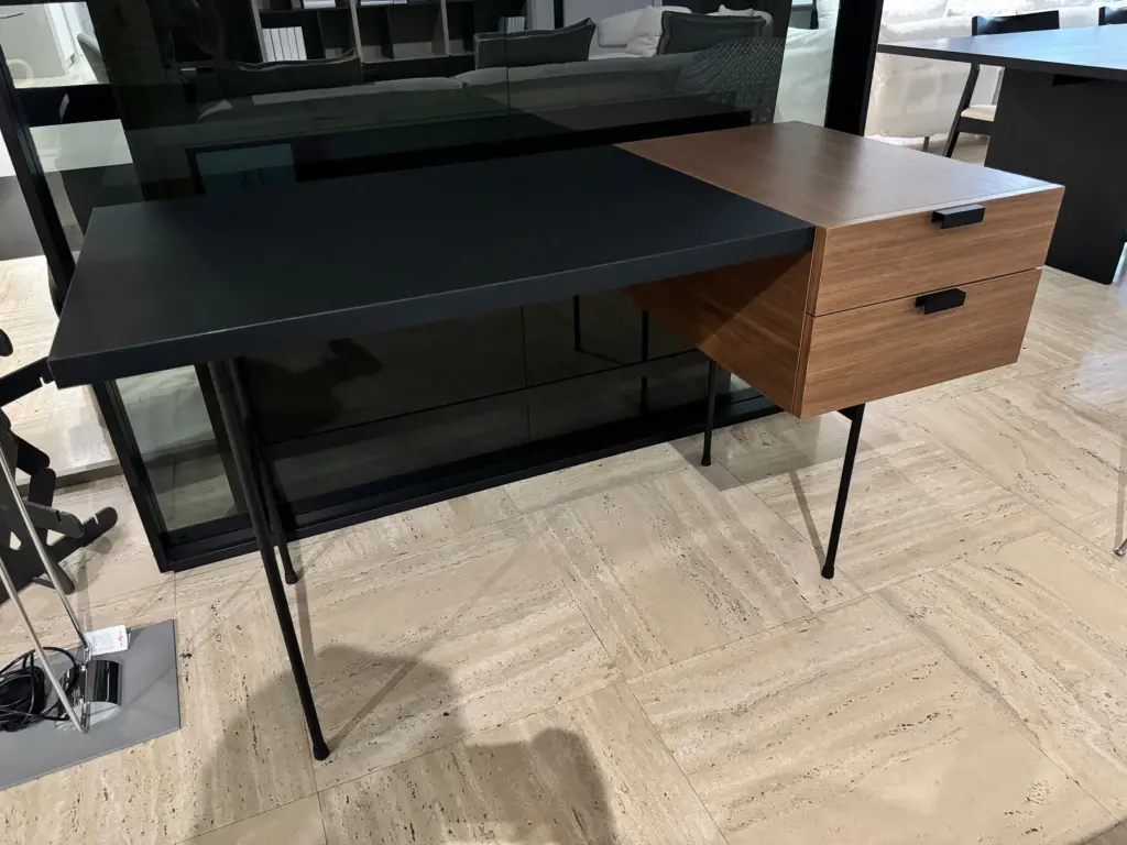Questa elegante scrivania combina un piano di scrittura in stratificato nero satinato con una base in acciaio laccato. Il blocco dei due cassetti, impiallacciato in noce naturale, aggiunge un tocco di calore e naturalezza, offrendo ampio spazio per l'organizzazione. Ideale per ambienti di lavoro contemporanei, la Scrivania Tanis unisce design sofisticato e funzionalitร , rendendola perfetta per ottimizzare il tuo spazio studio o ufficio.