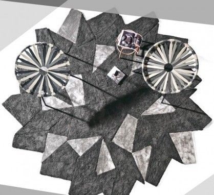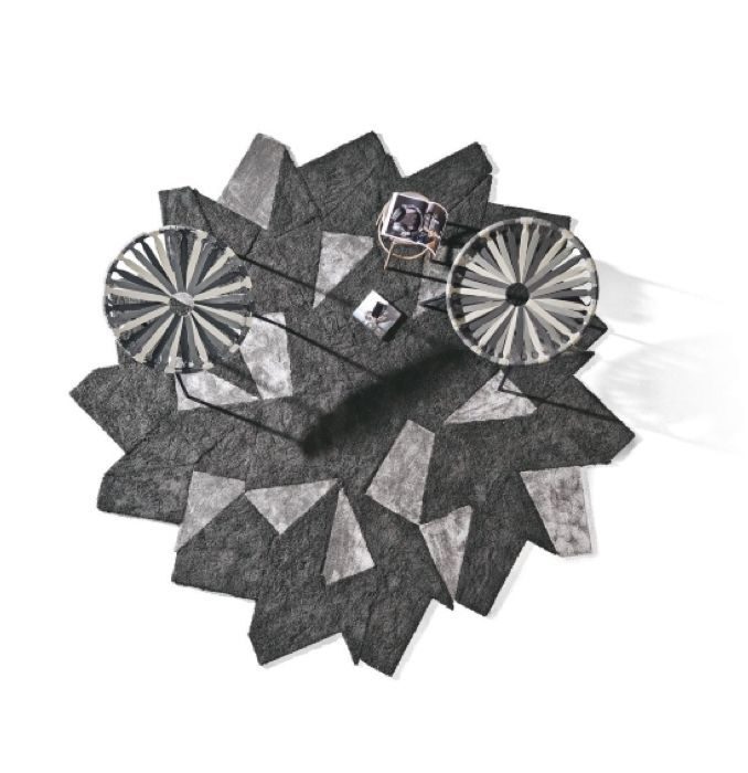Le finiture Curly nero e Flat fumo conferiscono un effetto materico sofisticato. Allo stesso tempo, il contrasto tra le texture dona profonditร  visiva e carattere, rendendo il tappeto protagonista dello spazio.