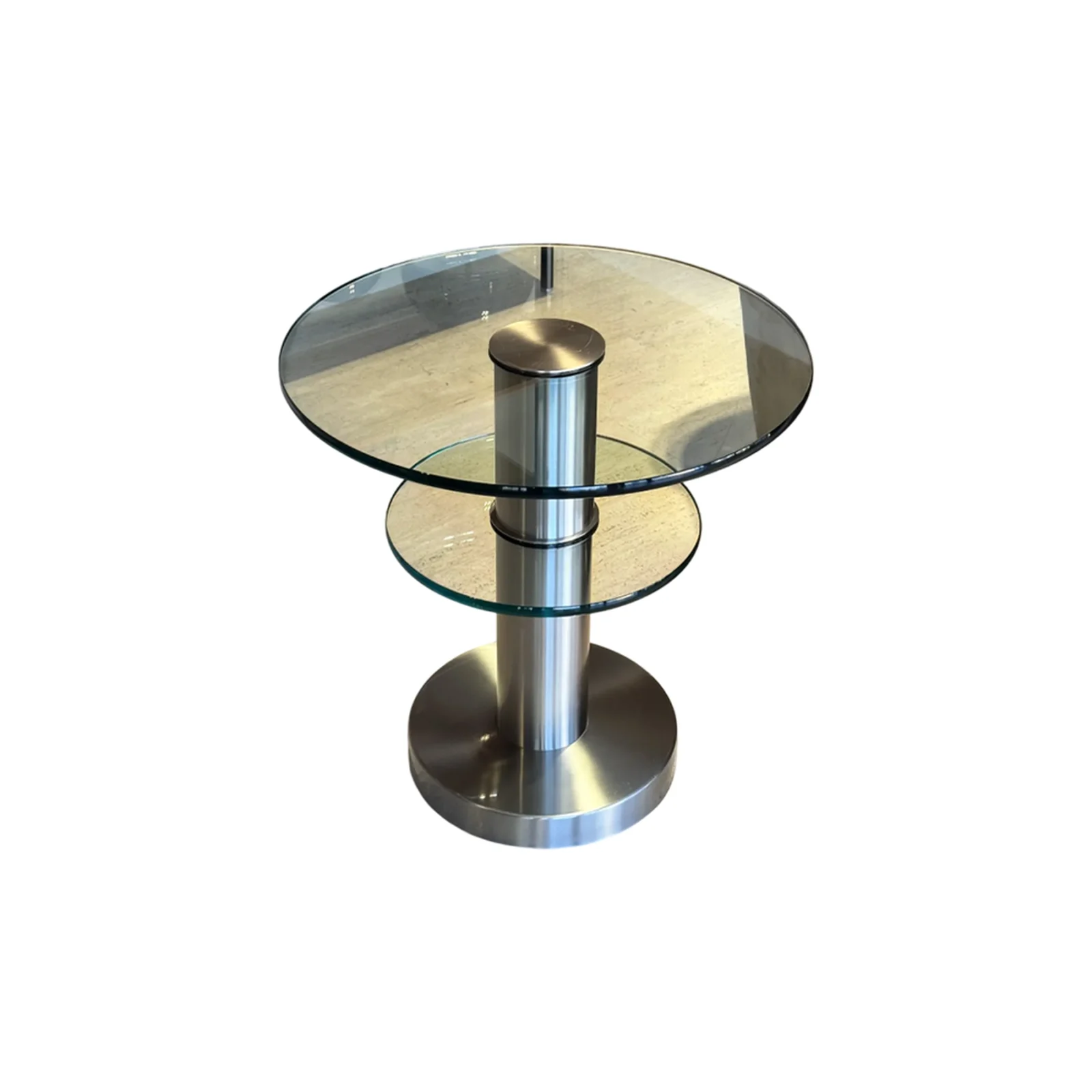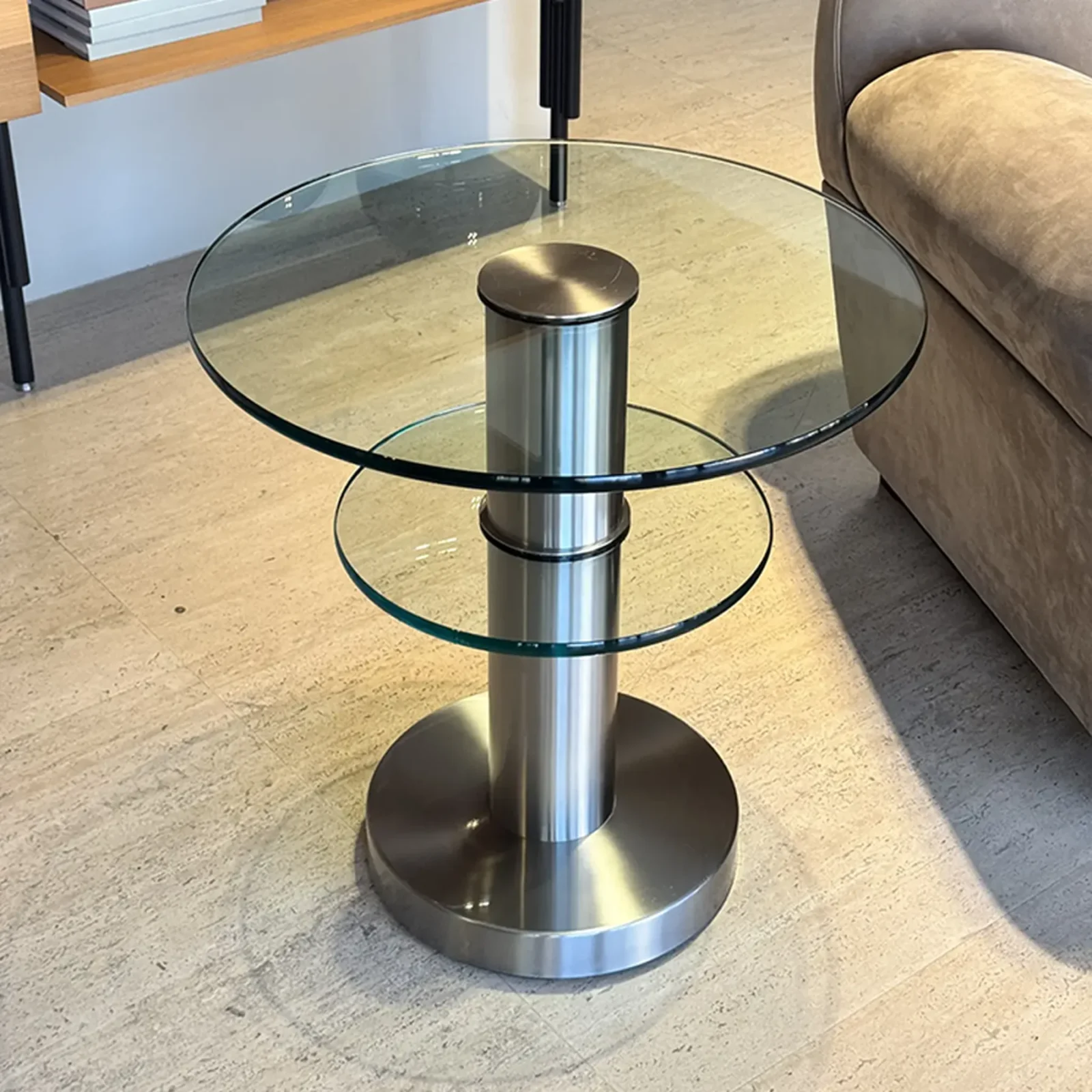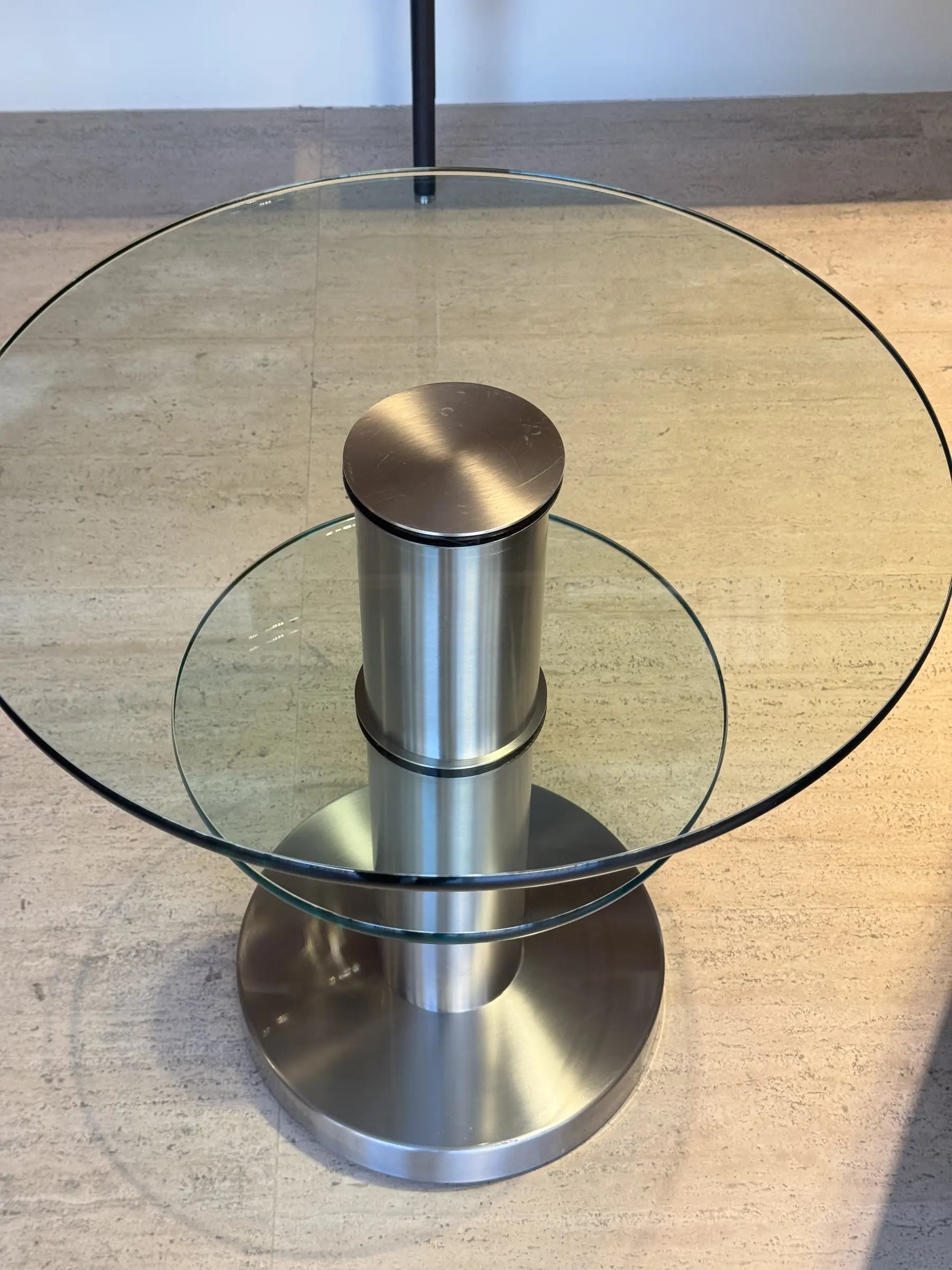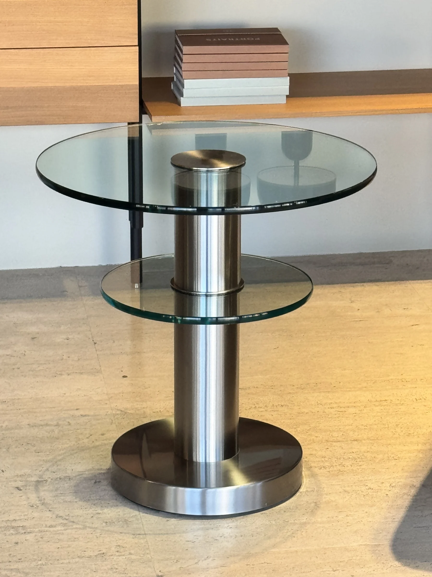 Questo tavolino, firmato da Gio Ponti nel 1932, rappresenta un'elegante sintesi di design moderno e materiali pregiati. Composto da due dischi in vetro float spessi 15 mm, il tavolino presenta una struttura in ottone nichelato e spazzolato che conferisce un aspetto luminoso. La struttura solida ed elegante รจ supportata da un piedistallo in metallo spazzolato, conferendo un look minimalista e sofisticato.