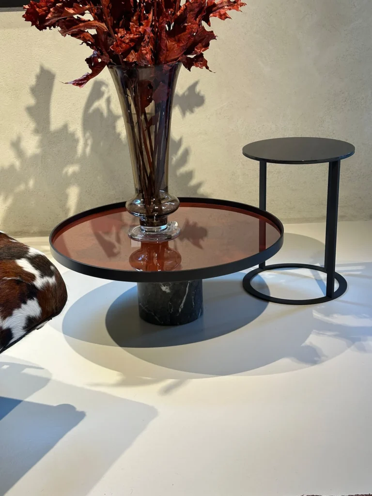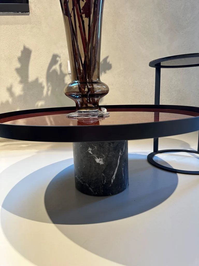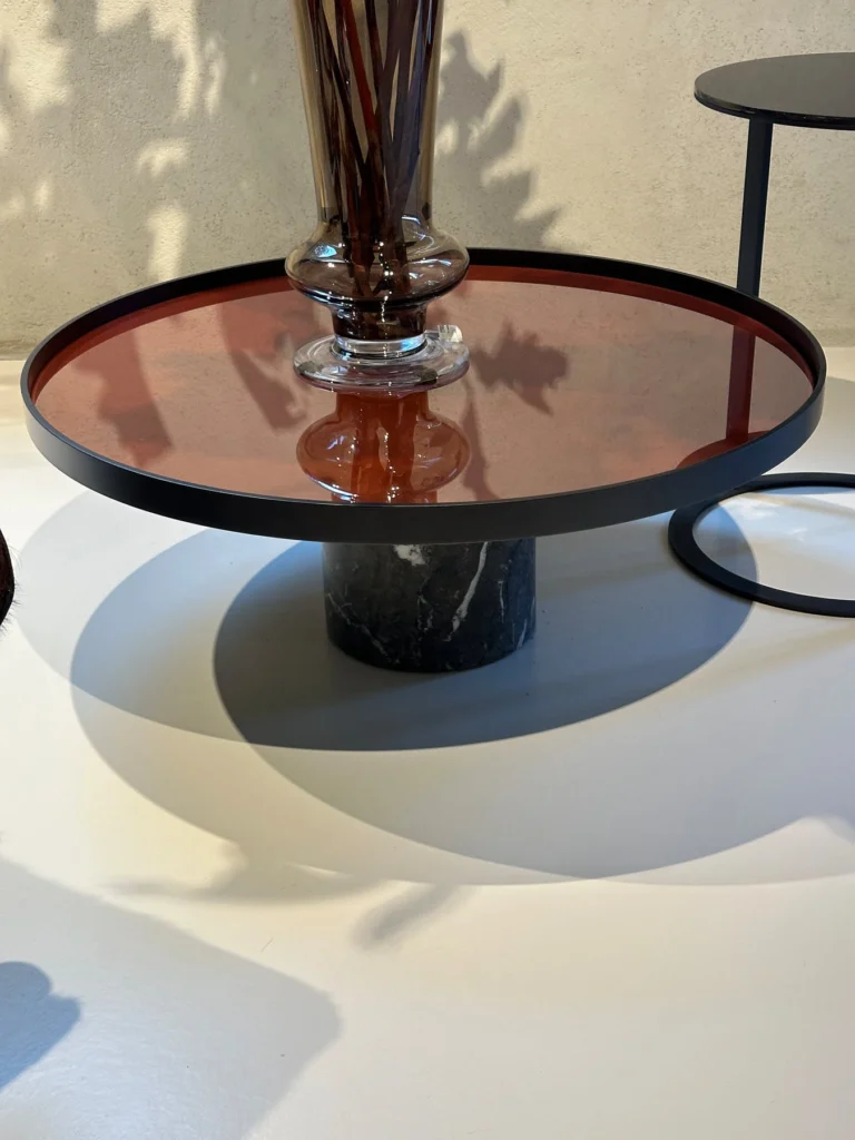 Disponibile nella versione tonda, il tavolino 9 presenta una base in Marmo Grigio Carnico, un piano in alluminio con finitura in vetro Rosso Mattone, e un stelo in metallo verniciato in antracite. La combinazione di materiali pregiati come il marmo e il vetro, uniti alla soliditร del metallo, conferisce al tavolino uno stile contemporaneo.
