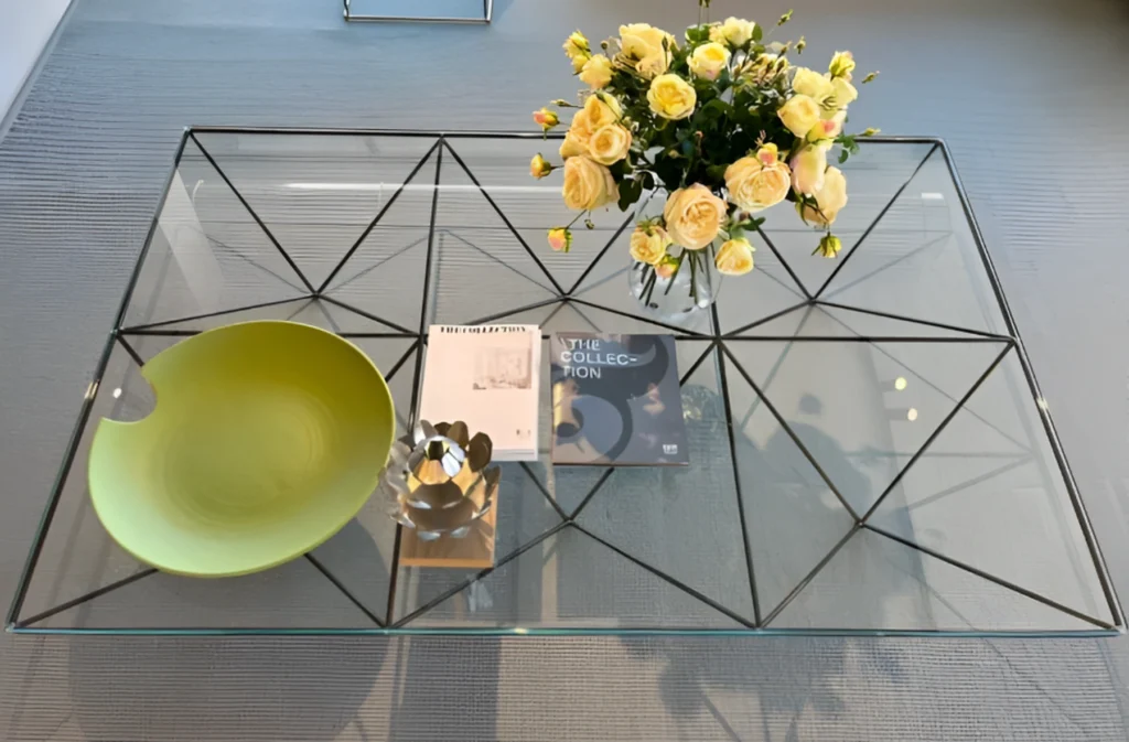 - Design: Il tavolino รจ caratterizzato da una struttura che ricorda un gruppo di piramidi rovesciate, formando una struttura geodetica. Questo reticolato, che funge sia da piedistallo che da supporto per il piano, gli conferisce un aspetto unico e dinamico. Il suo design evoca l'energia positiva, creando un punto focale in ogni ambiente.