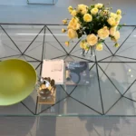 - Materiali: La struttura del tavolino รจ realizzata in tondino dโacciaio verniciato nero lucido, conferendo resistenza e una finitura elegante. Il piano รจ in vetro, che aggiunge luminositร e una sensazione di leggerezza al pezzo, esaltando la struttura geometrica sottostante.