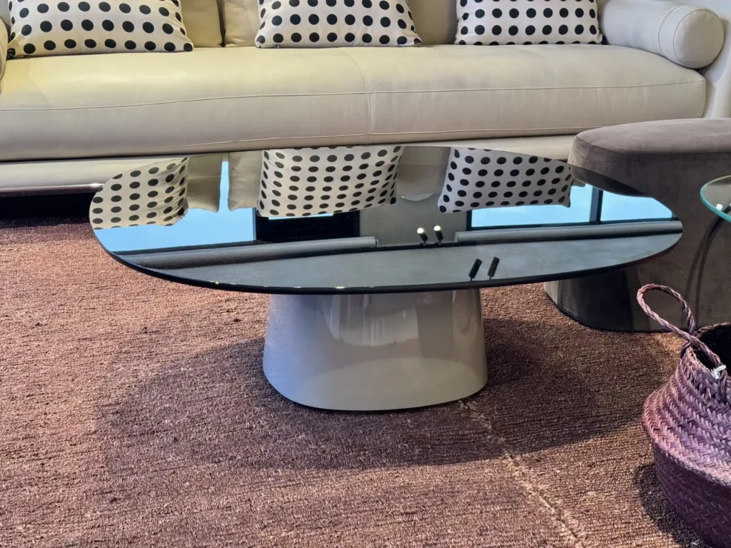 • Basamento: Il basamento del tavolino è realizzato in poliuretano rigido laccato con finitura grigia lucida, che aggiunge una sensazione di solidità e modernità. La base lucida si abbina armoniosamente al piano in vetro, esaltando il contrasto e creando un pezzo di arredamento visivamente interessante.