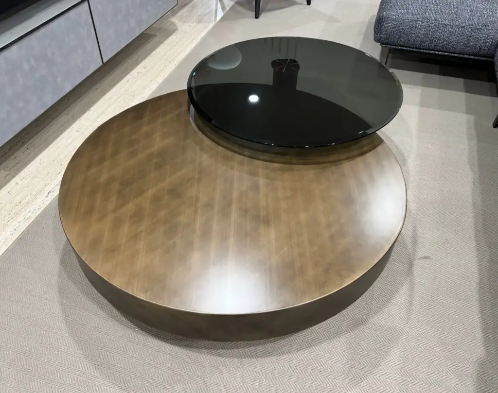 Il tavolino Arena Bond si caratterizza per una base in acciaio verniciato goffrato nero e un piano in finitura Brushed Bronze o Brushed Grey. Nella versione BOND, il tavolino principale รจ affiancato rispettivamente da uno o due tavolini aggiuntivi. Questi tavolini aggiuntivi presentano una base in acciaio verniciato goffrato nero, una colonna in acciaio verniciato Brushed Bronze o Brushed Grey e un piano girevole in cristallo bisellato fumรฉ. La forma circolare, ispirata a un'arena, รจ il fulcro del design di questa collezione, offrendo una soluzione estetica e funzionale per ambienti moderni.