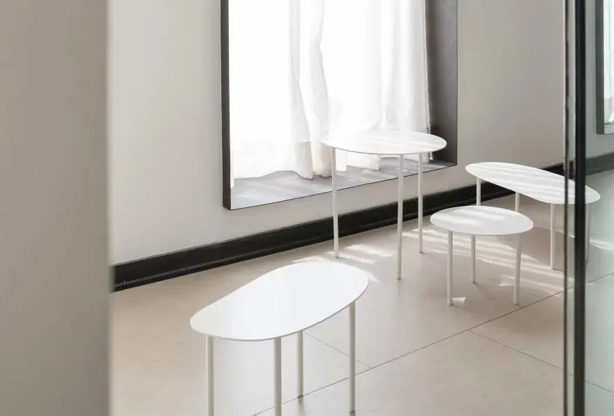 La collezione comprende tavolini di diverse forme e dimensioni, accomunati da un disegno curvilineo e da angoli arrotondati che alleggeriscono visivamente la struttura. Inoltre, lโutilizzo della lamiera dโacciaio per il piano garantisce soliditร e resistenza, mantenendo al tempo stesso una linea pulita e minimale. Le superfici sono sostenute da gambe in tubo dโacciaio, fissate direttamente al piano per assicurare stabilitร e coerenza estetica.