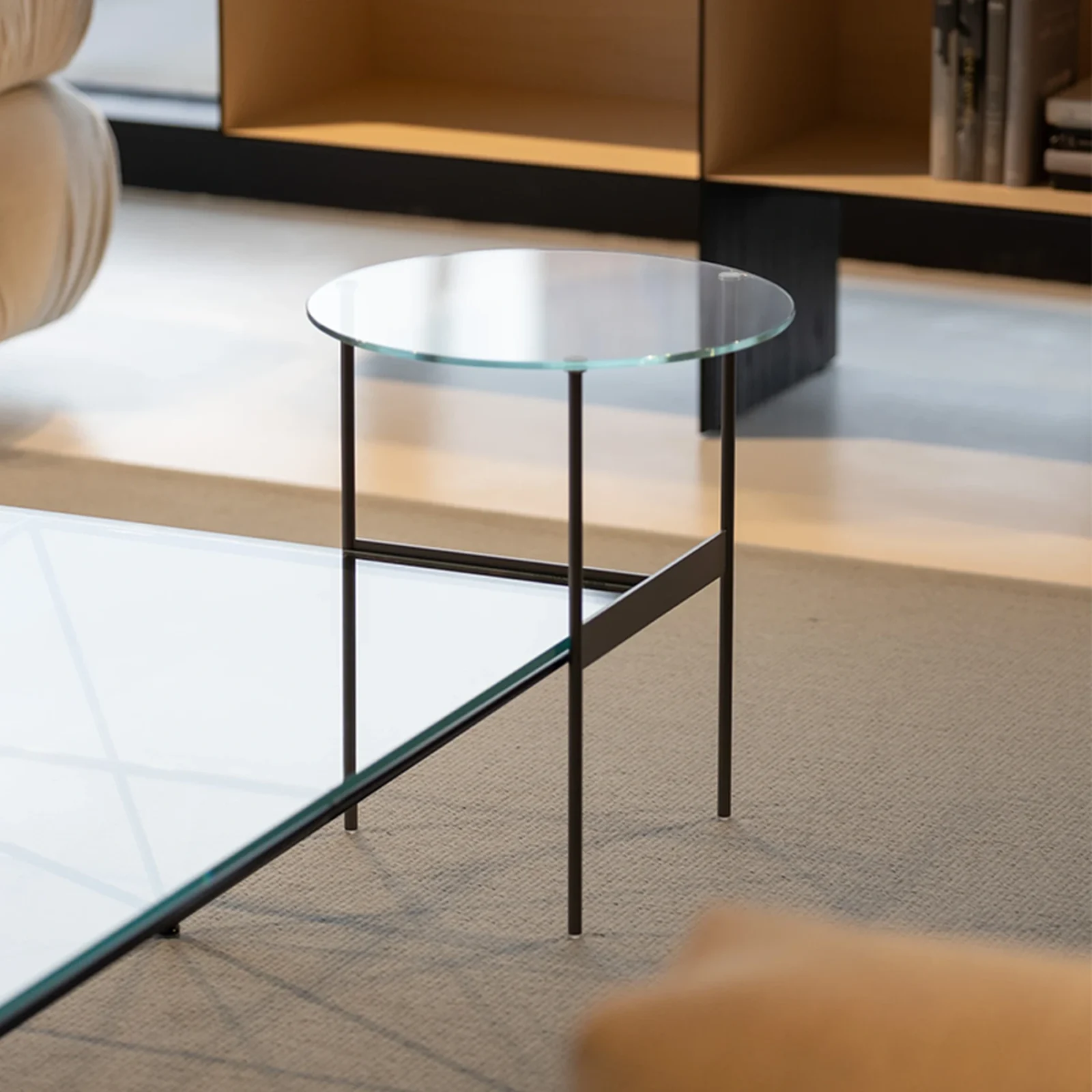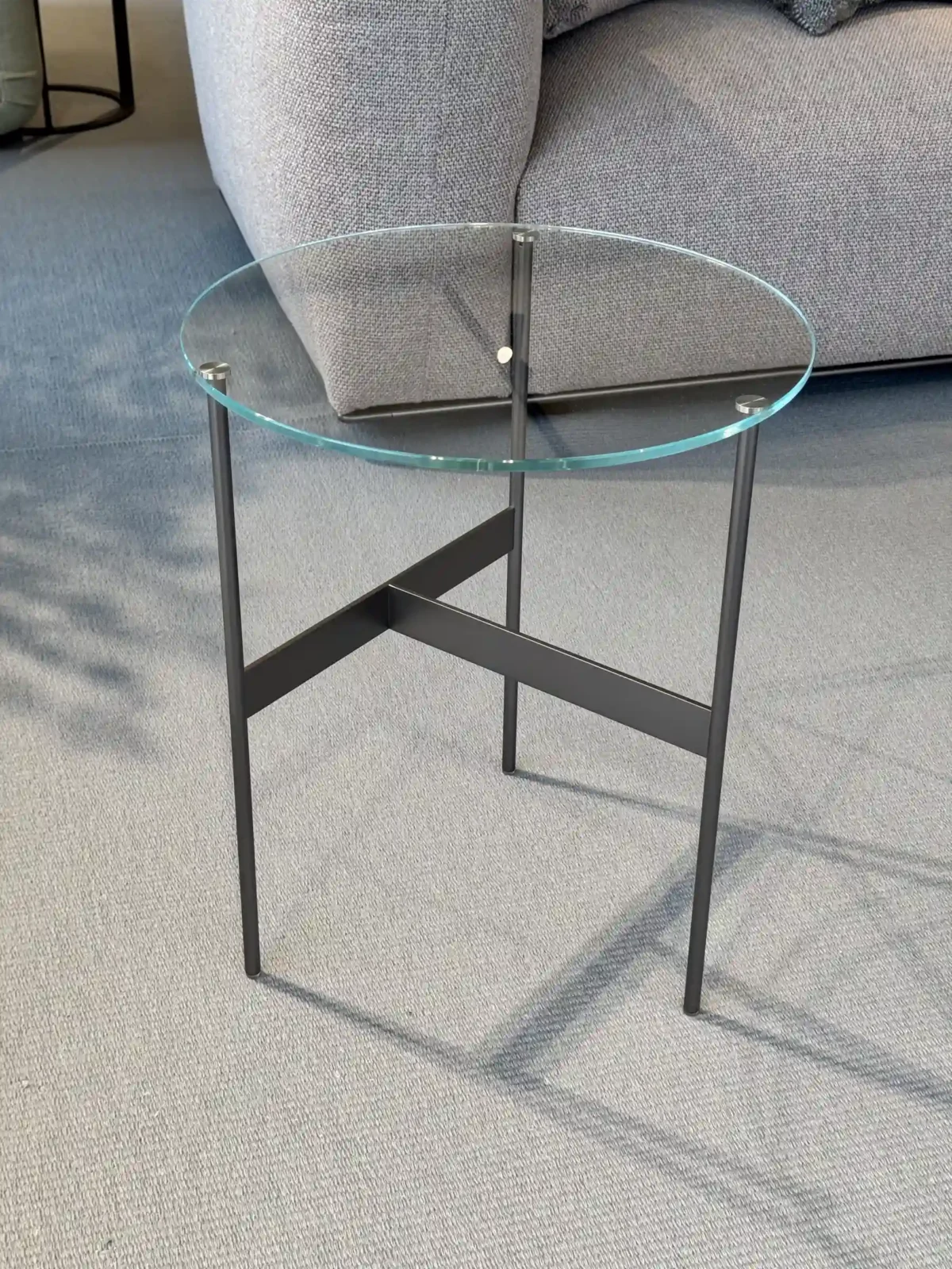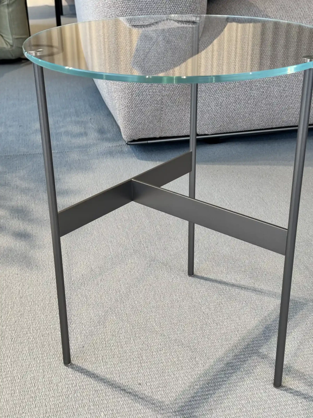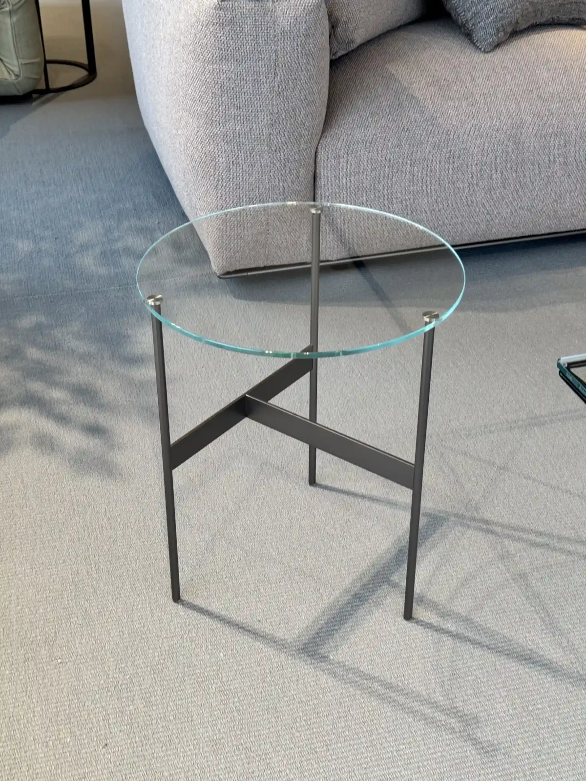 Formiche รจ proposto con piano di soli 8 mm di spessore in vetro extra chiaro, la struttura sottile in tondino d'acciaio verniciato peltro conferisce al tavolino un aspetto etereo e moderno, con un design a cavalletto che supporta il piano tramite traverse sottili.