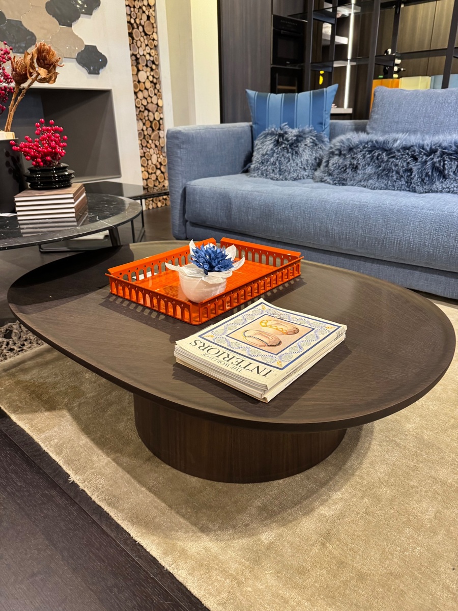 Il piano, ampio e raffinato, mette in risalto le naturali venature dellโessenza, che si uniscono a un disegno radiale ottenuto tramite unโaccurata lavorazione delle superfici. Questo dettaglio dona profonditร materica e trasforma il tavolino in un vero elemento scultoreo. Inoltre, la base decentrata crea un piacevole effetto di sospensione, rendendo ogni ambiente piรน dinamico e contemporaneo.