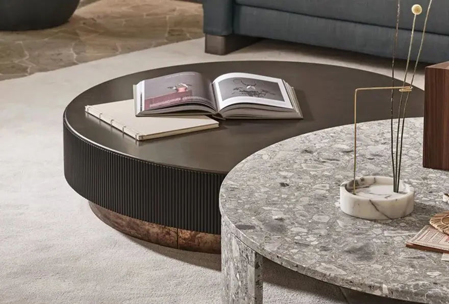 Questa versione del tavolino รจ proposta con piano in pelle scamosciata colore Sand, una finitura raffinata che valorizza la superficie del tavolino e crea un contrasto materico elegante.