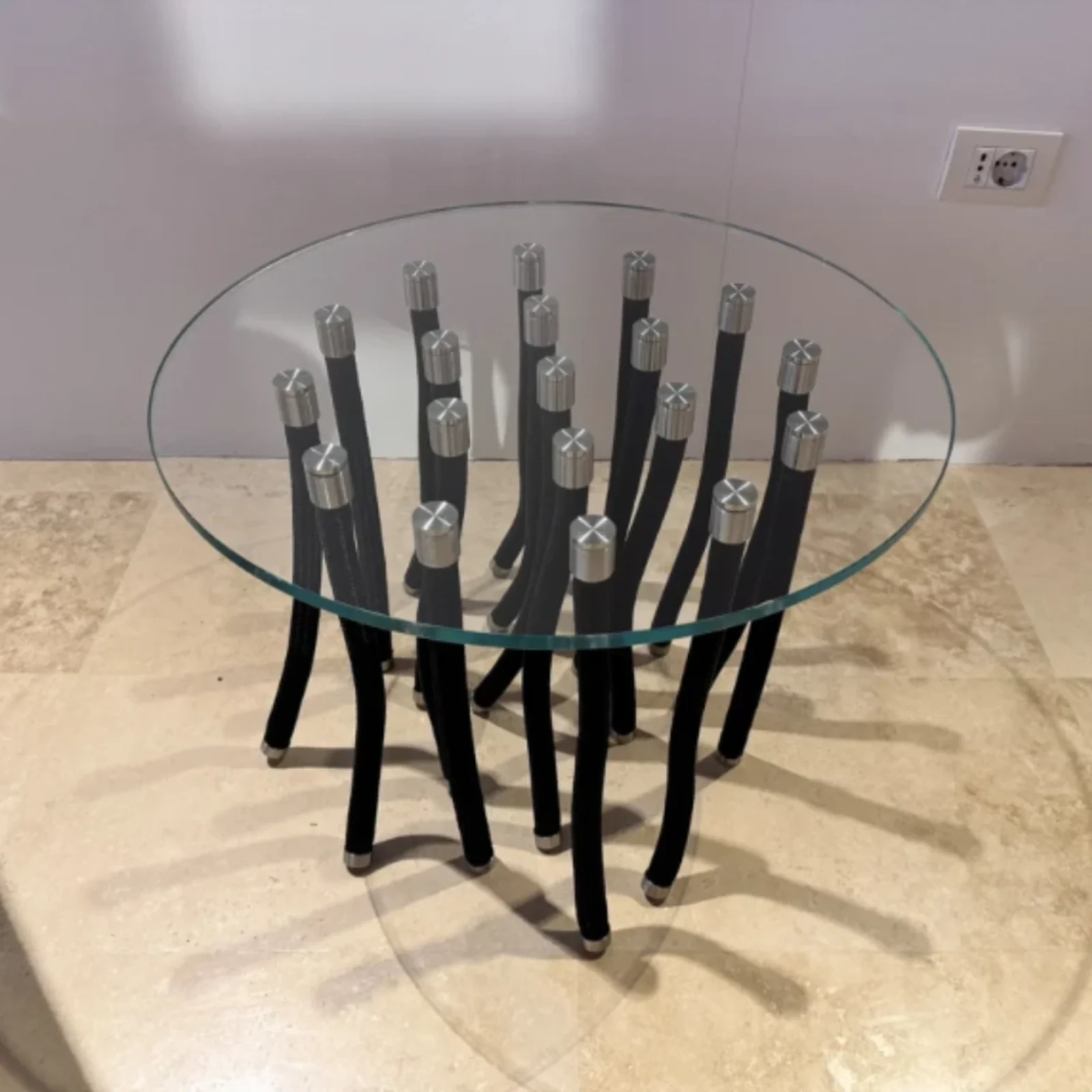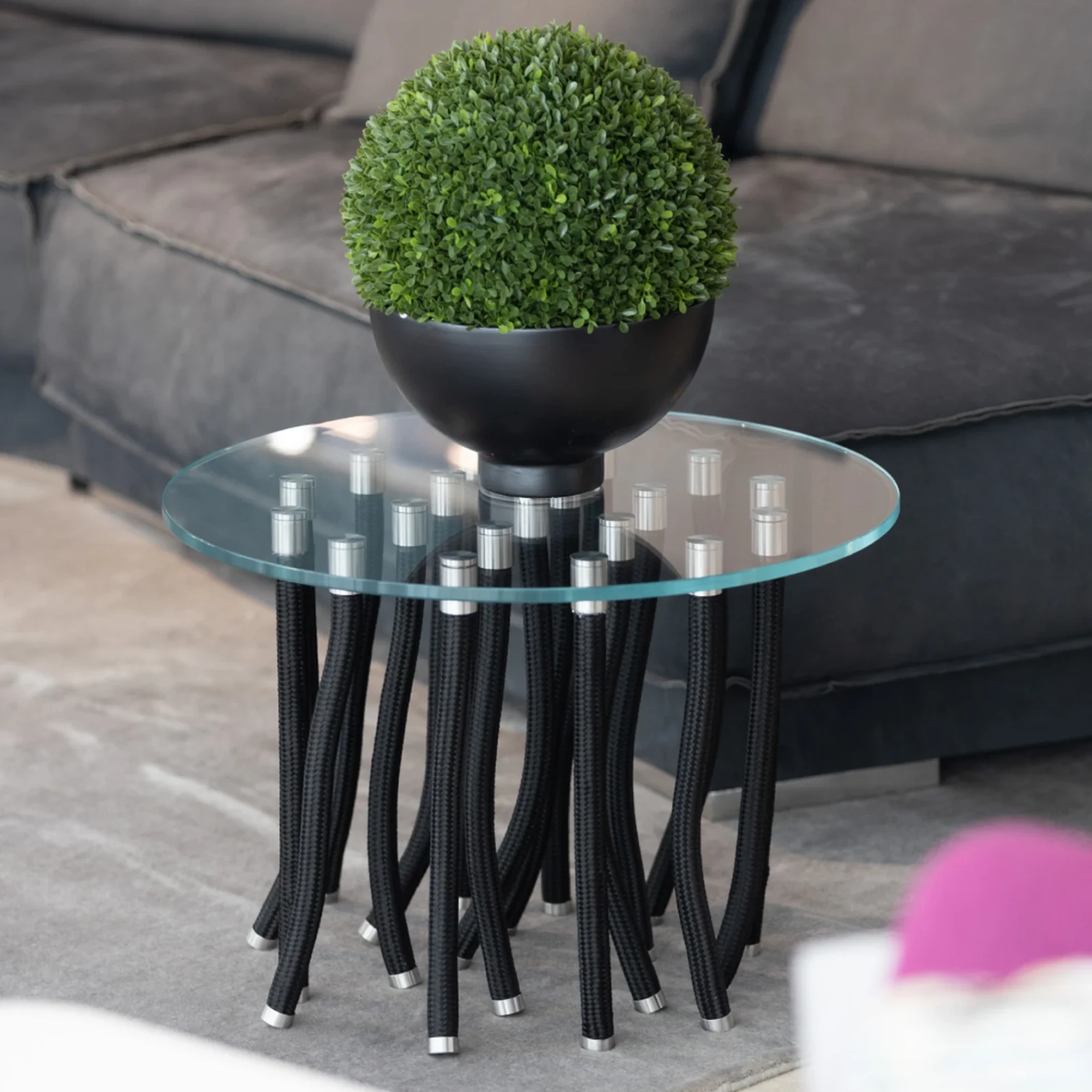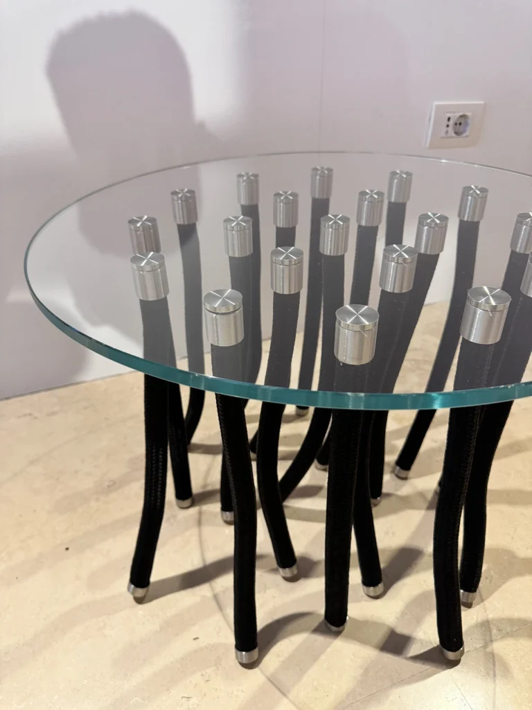 Il tavolino Org รจ caratterizzato da una struttura che combina elementi in corda intrecciata di polipropilene con sostegni rigidi in acciaio. Questa combinazione di materiali flessibili e rigidi crea un contrasto visivo interessante e una struttura robusta e duratura. Grazie alla particolare conformazione della struttura, il tavolino Org dร  l'illusione che il piano in vetro temperato trasparente fluttui nell'aria. Questo effetto di sospensione rende il tavolino un vero e proprio pezzo d'arte che cattura l'attenzione in ogni ambiente. Il piano del tavolino รจ realizzato in vetro temperato trasparente, un materiale resistente e sicuro. Il bordo smussato del piano aggiunge un ulteriore livello di sicurezza, rendendo il tavolino adatto anche a spazi frequentati da bambini.