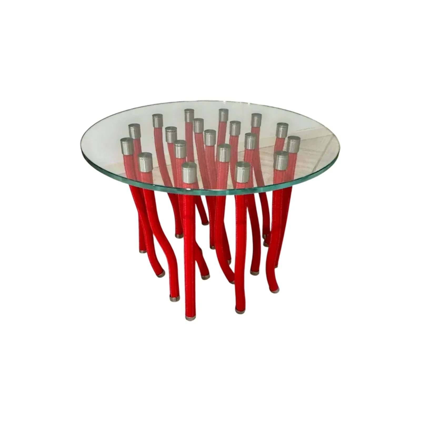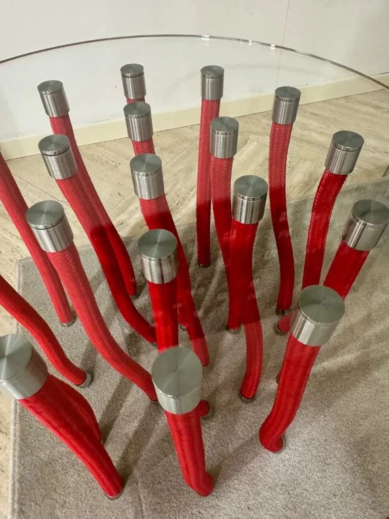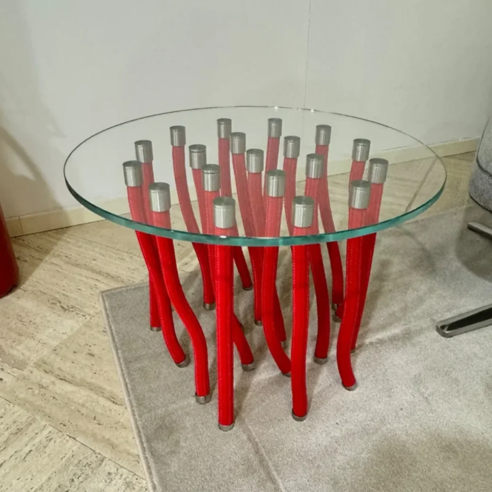 Il tavolino Org รจ caratterizzato da una struttura che combina elementi in corda intrecciata di polipropilene con sostegni rigidi in acciaio. Questa combinazione di materiali flessibili e rigidi crea un contrasto visivo interessante e una struttura robusta e duratura. Grazie alla particolare conformazione della struttura, il tavolino Org dร l'illusione che il piano in vetro temperato trasparente fluttui nell'aria. Questo effetto di sospensione rende il tavolino un vero e proprio pezzo d'arte che cattura l'attenzione in ogni ambiente. Il piano del tavolino รจ realizzato in vetro temperato trasparente, un materiale resistente e sicuro. Il bordo smussato del piano aggiunge un ulteriore livello di sicurezza, rendendo il tavolino adatto anche a spazi frequentati da bambini.