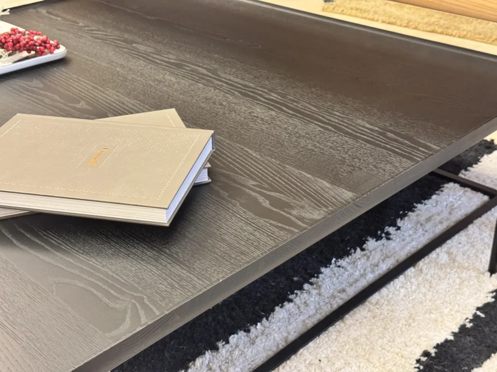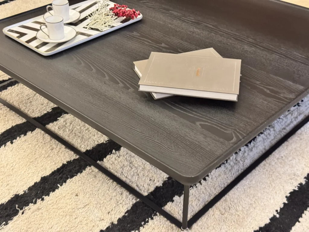• Base: La base nera del tavolino si sposa perfettamente con il piano in frassino tinto nero, creando un effetto coeso.