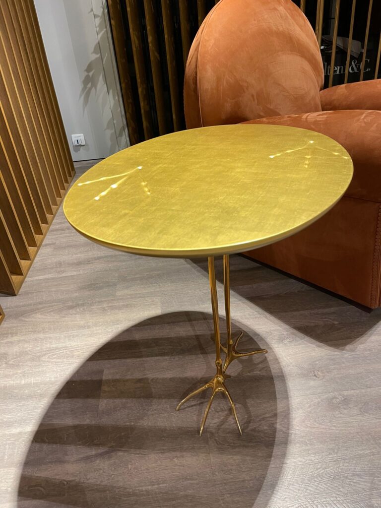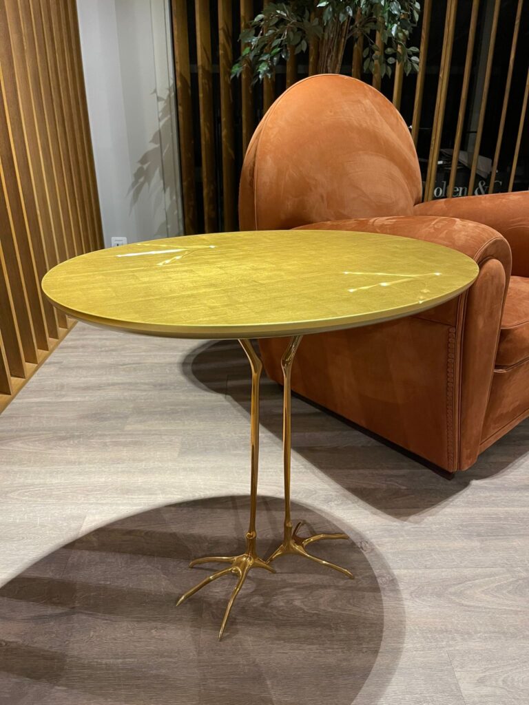 Il tavolo Traccia, disegnato da Meret Oppenheim nel 1939, รจ una creazione artistica e iconica, prodotta da Simon International a Milano nei primi anni Settanta. Questo pezzo unico presenta un piano in legno ornato da impronte in rilievo di uccelli, rivestito in foglia dโoro per un effetto di lusso e fascino senza tempo. Le gambe, realizzate in bronzo lucido, riproducono elegantemente la forma delle zampe di un uccello, conferendo al tavolo un carattere giocoso e unโestetica distintiva. Un'opera dโarte che porta un tocco di ironia e storia a qualsiasi ambiente.