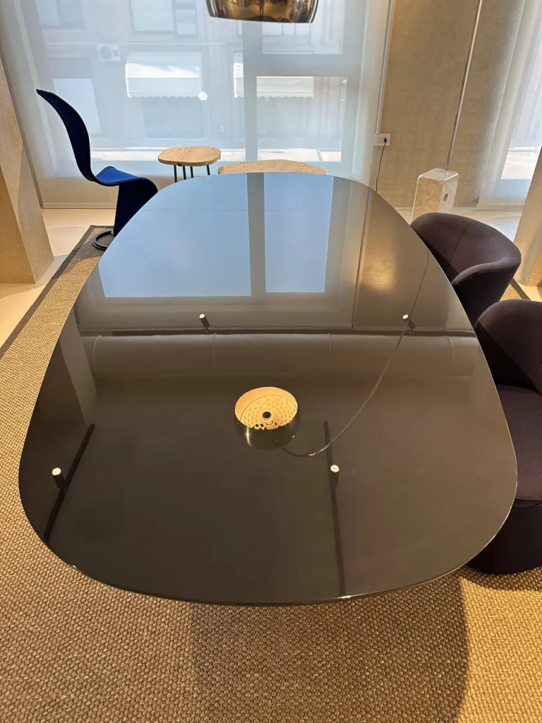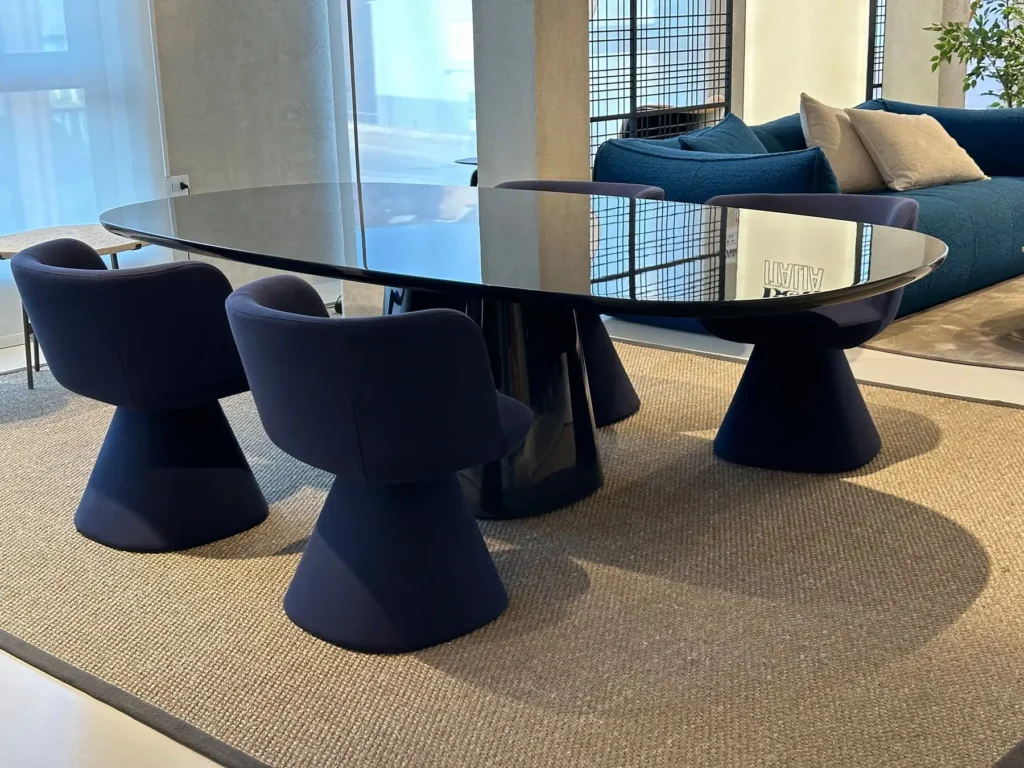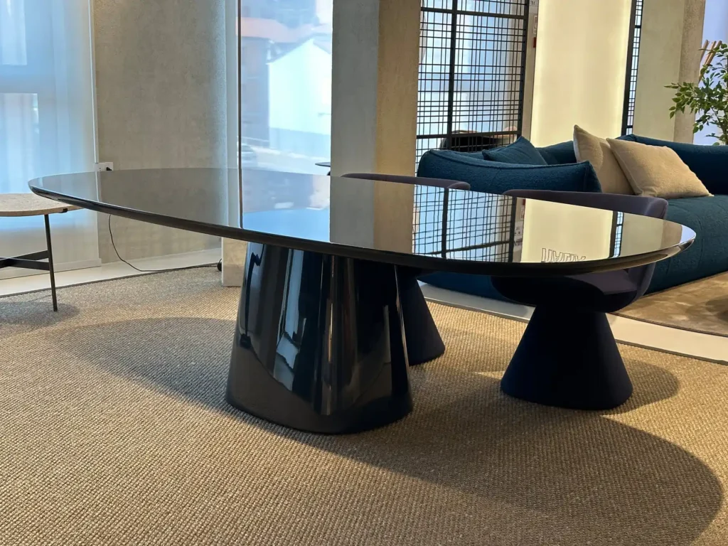 Allure Oโ รจ un tavolo dal design elegante, ispirato al fascino intramontabile del glamour reinterpretato in chiave moderna. Il tavolo, progettato per evocare lo stile distintivo di Jackie Oโ, richiama la forma ellittica del famoso specchio Madison disegnato da Monica Armani. La linea del piano รจ un perfetto equilibrio tra curve morbide e linee rette con angoli smussati che conferiscono un effetto visivo leggero e dinamico e capace di ospitare comodamente da quattro a otto persone. La base a tronco di piramide, dalle proporzioni eleganti, offre una stabilitร sia strutturale che estetica, in perfetta armonia con la forma del piano.