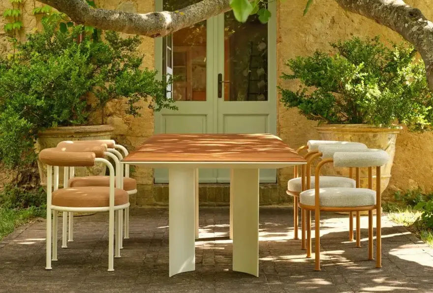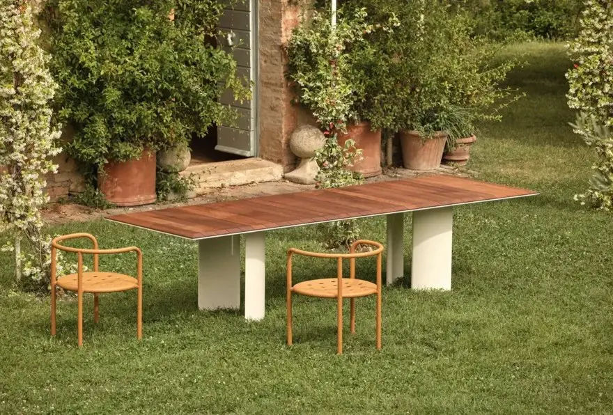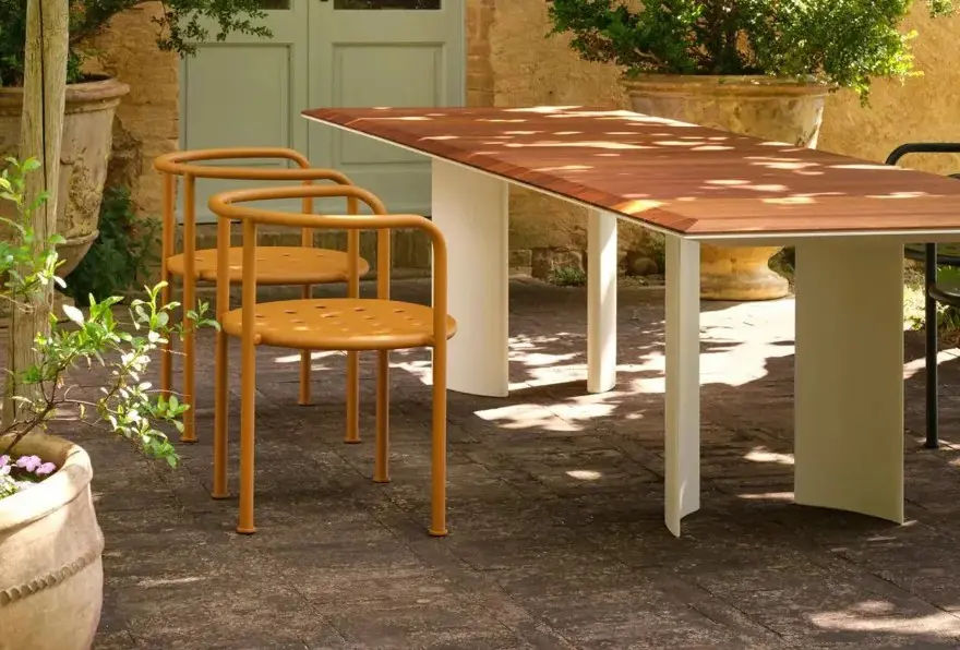 La struttura in alluminio verniciato Bianco Burro conferisce leggerezza visiva e resistenza agli agenti atmosferici. Allo stesso tempo, il piano in legno di Iroko introduce una nota calda e naturale, creando un raffinato contrasto con il metallo. Questa combinazione rende il tavolo Naca ideale per terrazze, giardini e spazi contract allโaperto.