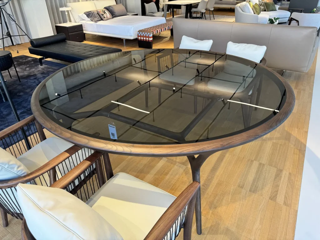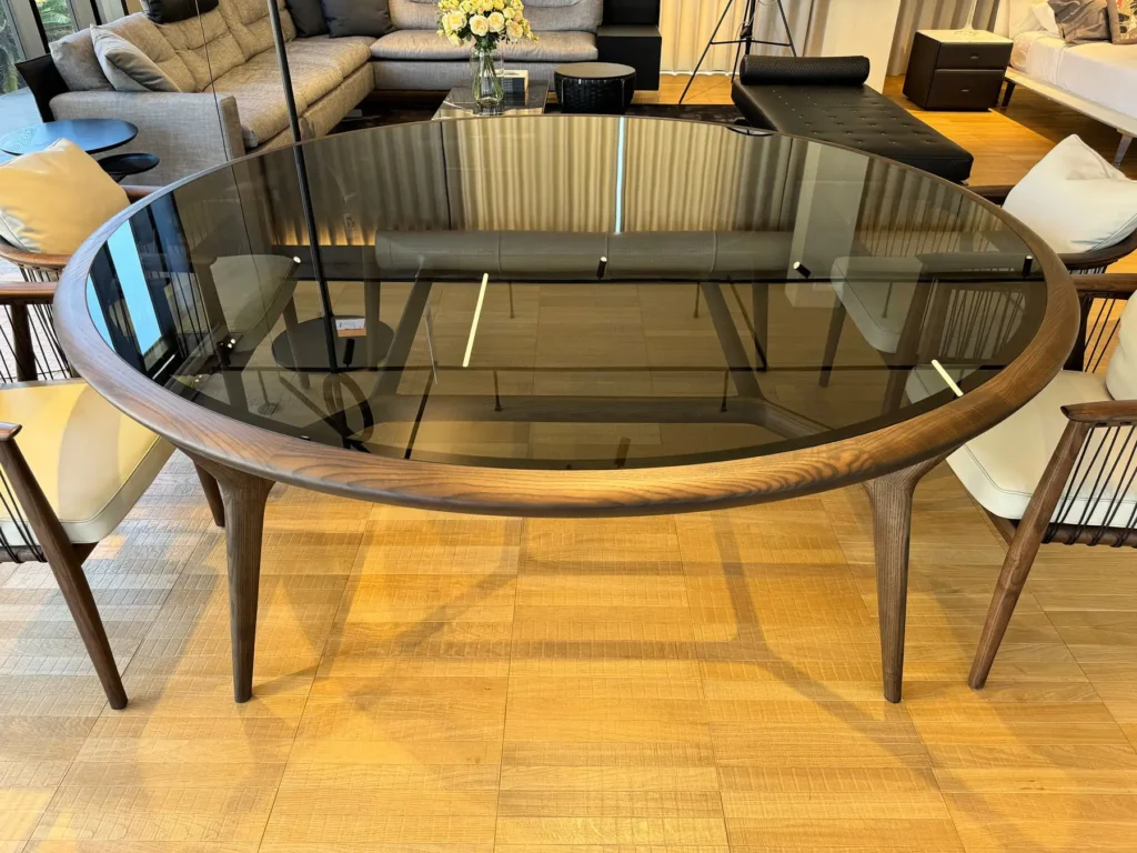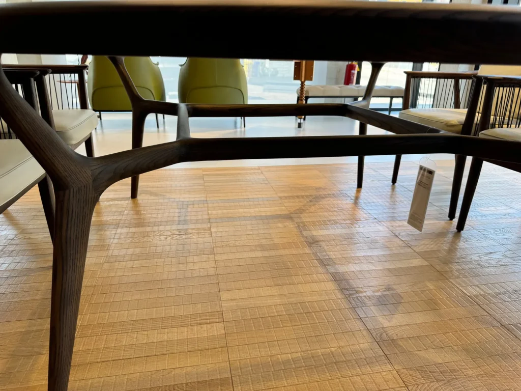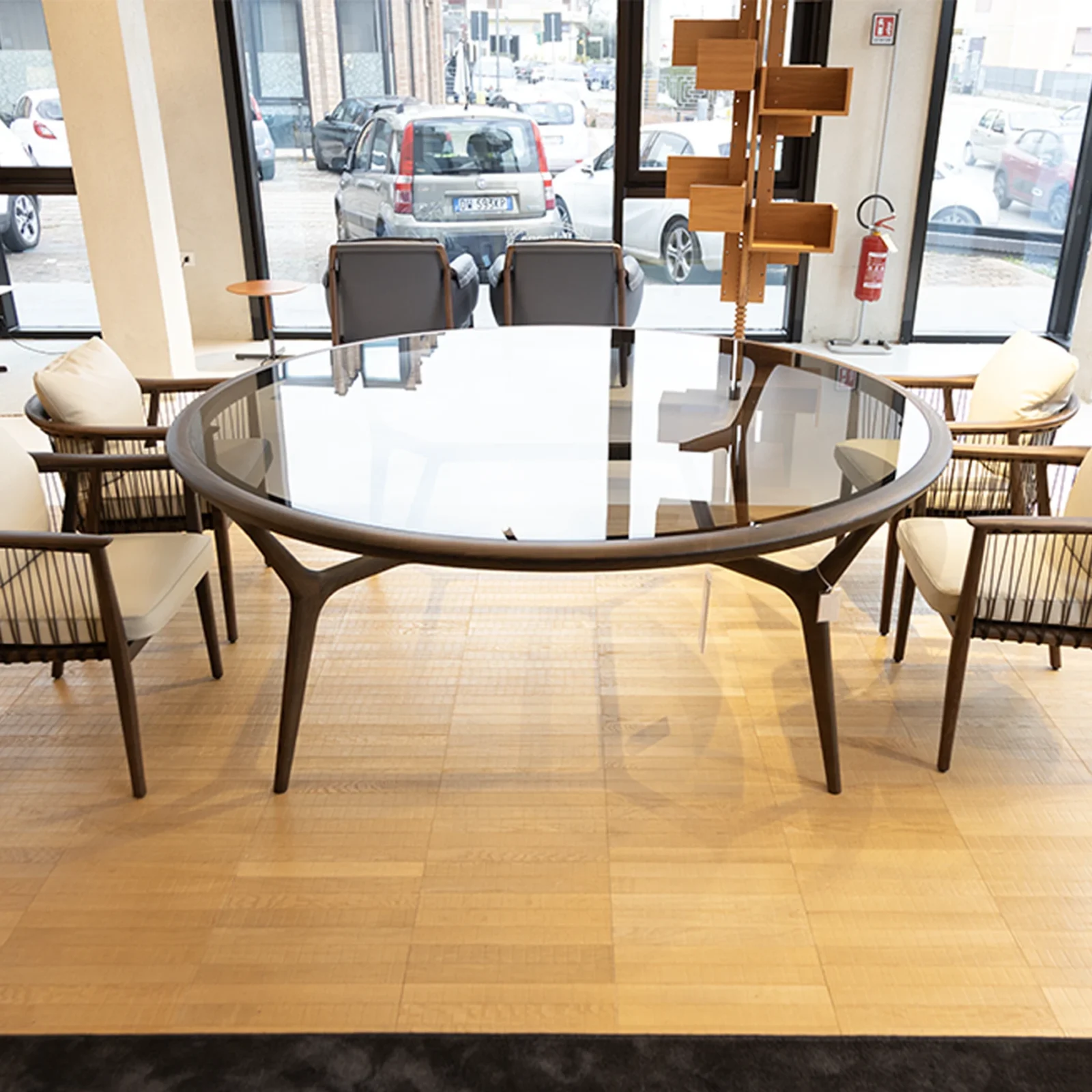 Pezzo d'arredo che unisce magistralmente design moderno e classe artigianale, adattandosi perfettamente anche agli ambienti piรน classici. Realizzato in massello di noce americano, il tavolo si distingue per le sue linee strutturali che richiamano le architetture a ponte tipiche del design organico. Le quattro gambe che si connettono a travi e aste creano una composizione visivamente leggera ma solida, che esprime l'essenza del tavolo come un'opera d'arte funzionale.