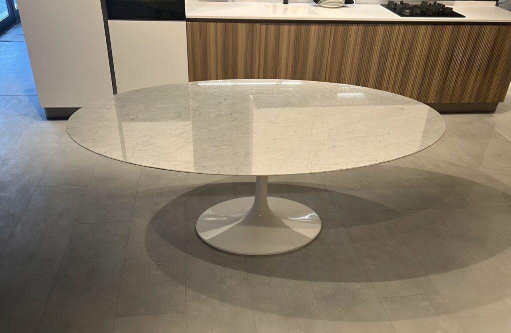 Firmato da Eero Saarinen per Knoll, questo tavolo ovale presenta un piano in marmo e una base in alluminio trattato,... Leggi di piรน