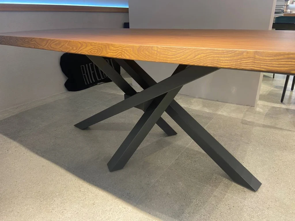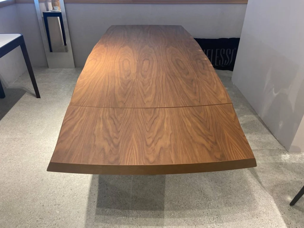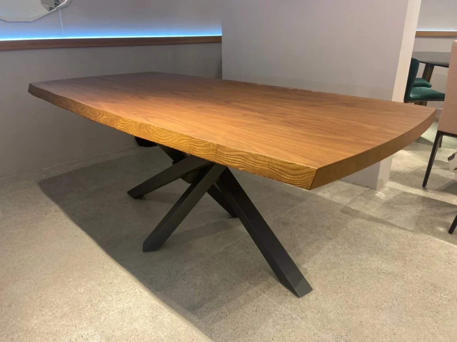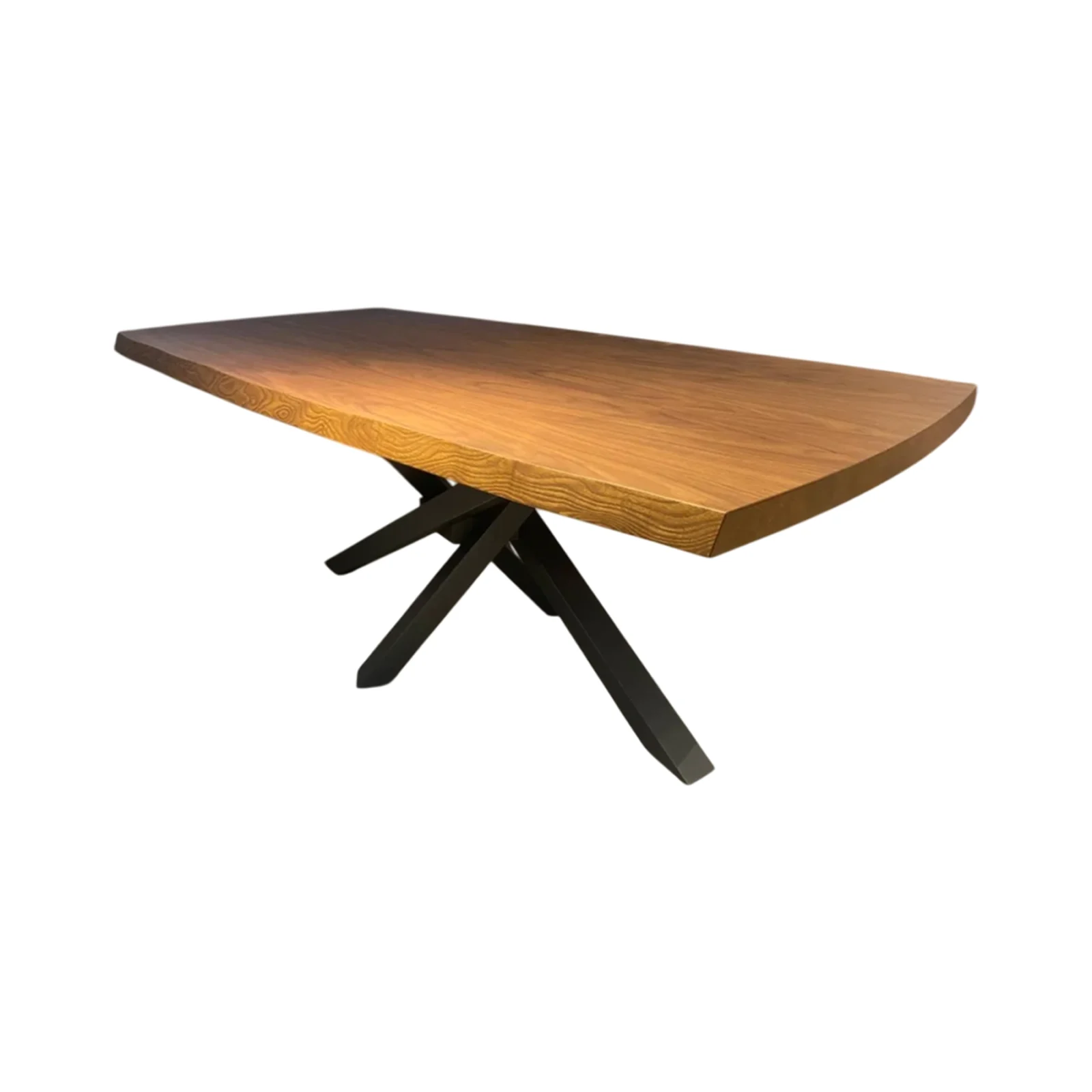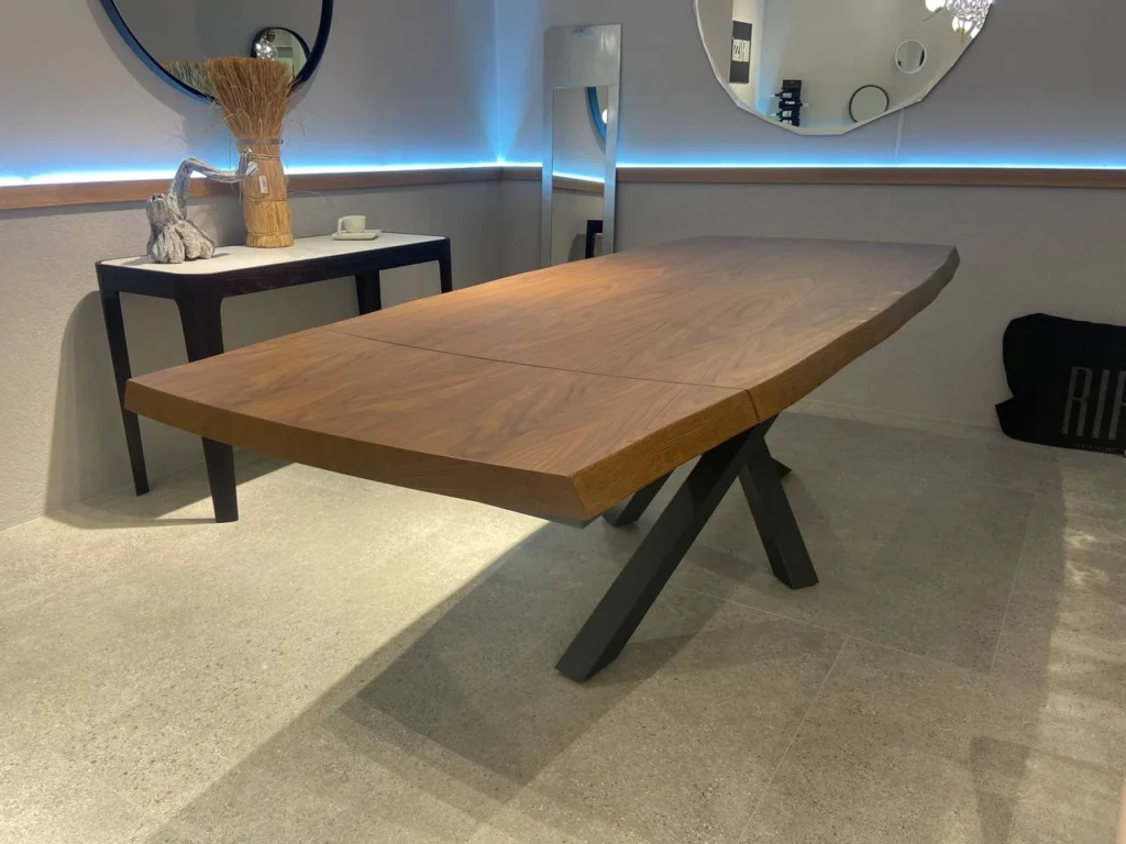 Il tavolo allungabile modello Shangai di Riflessi combina eleganza e funzionalitร in un design distintivo. Il suo piano a botte con bordi irregolari, realizzato in pregiato legno di noce canaletto spesso 50 cm, offre un effetto naturale e sofisticato. La struttura รจ completata da solide gambe in metallo verniciato grafite, disposte in modo incrociato per donare stabilitร e un tocco di modernitร .