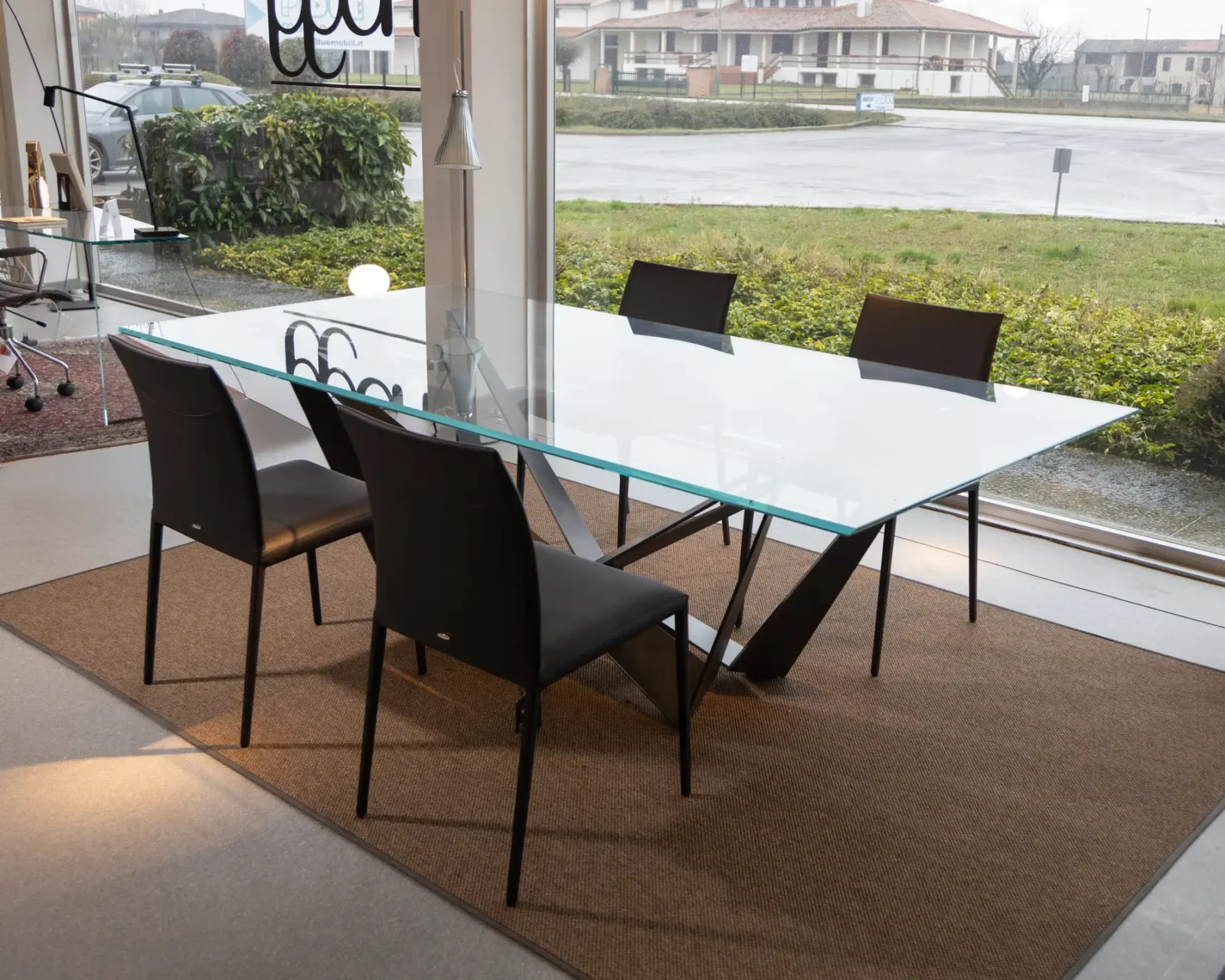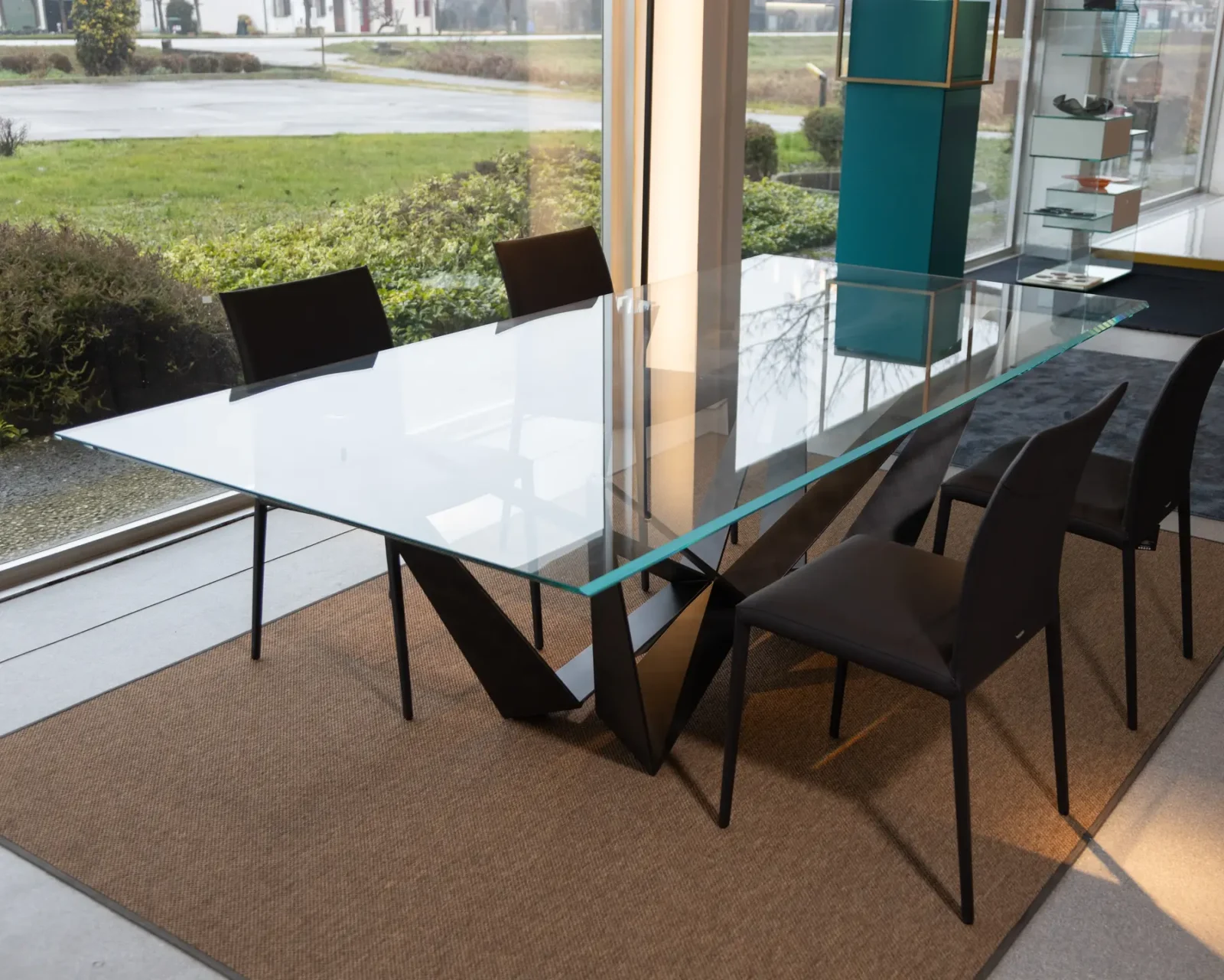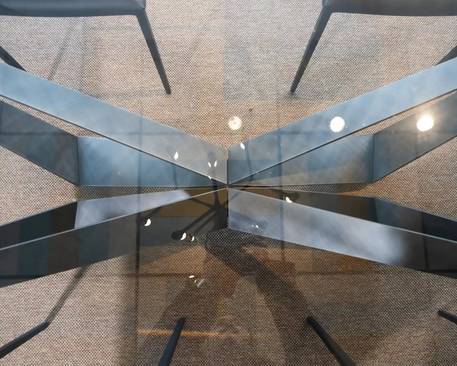 La base incrociata in metallo, dal design architettonico e dinamico, richiama la purezza delle forme geometriche e la precisione degli origami, dando vita a una struttura che sembra sospesa nello spazio. Su di essa si appoggia con eleganza un piano in cristallo trasparente da 15 mm di spessore, che amplifica la luminositร  e la percezione visiva dellโ€™ambiente.