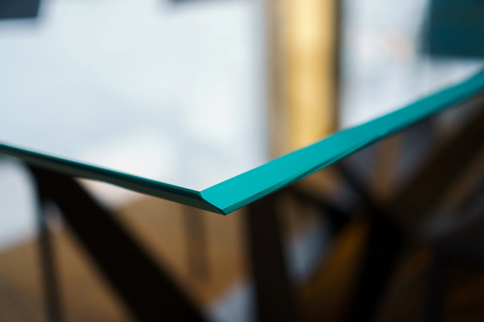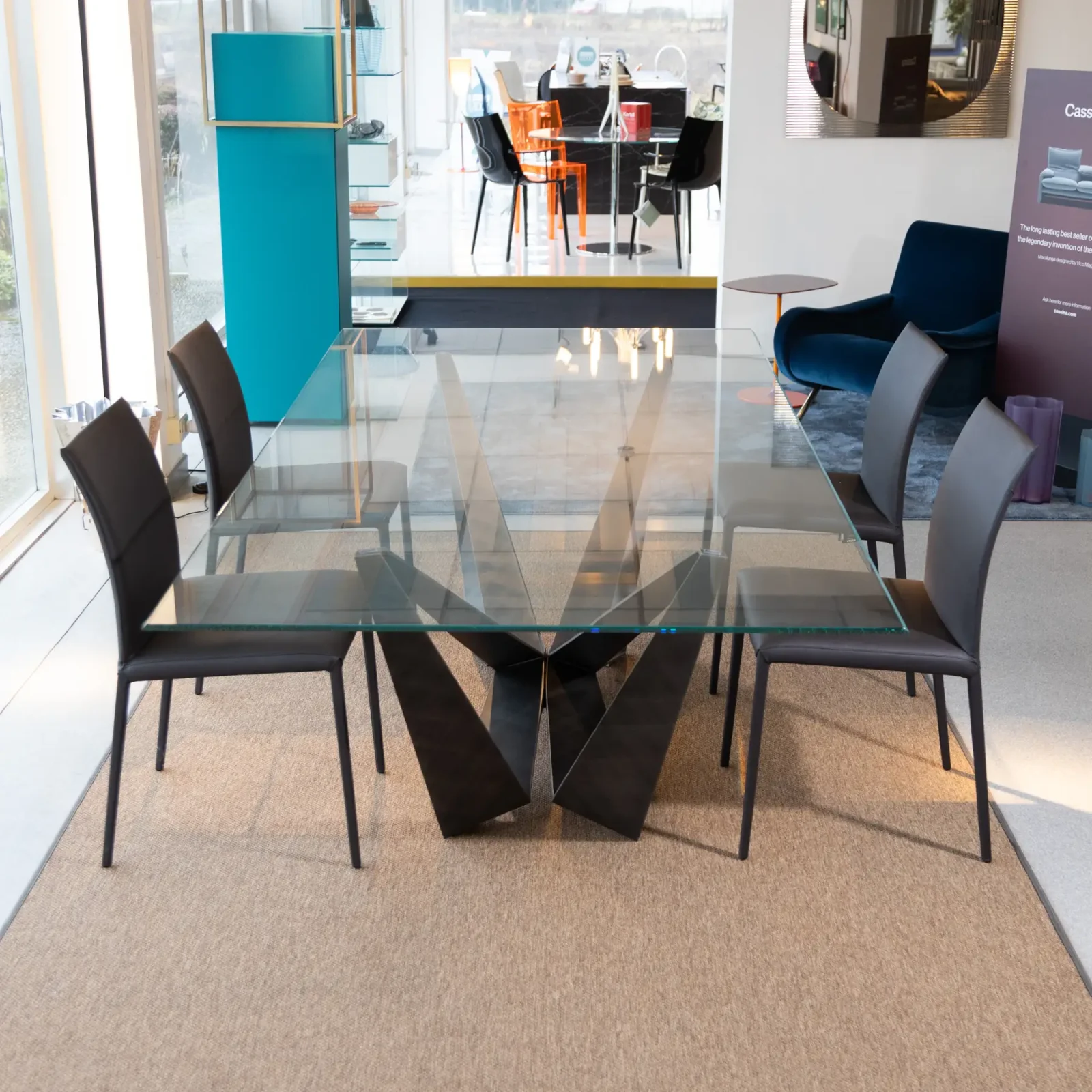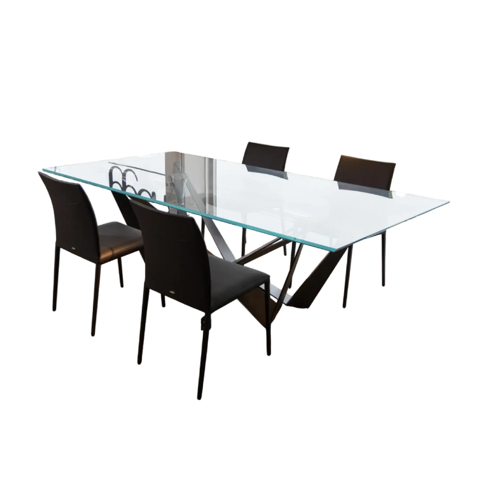 La base incrociata in metallo, dal design architettonico e dinamico, richiama la purezza delle forme geometriche e la precisione degli origami, dando vita a una struttura che sembra sospesa nello spazio. Su di essa si appoggia con eleganza un piano in cristallo trasparente da 15 mm di spessore, che amplifica la luminositร  e la percezione visiva dellโ€™ambiente.