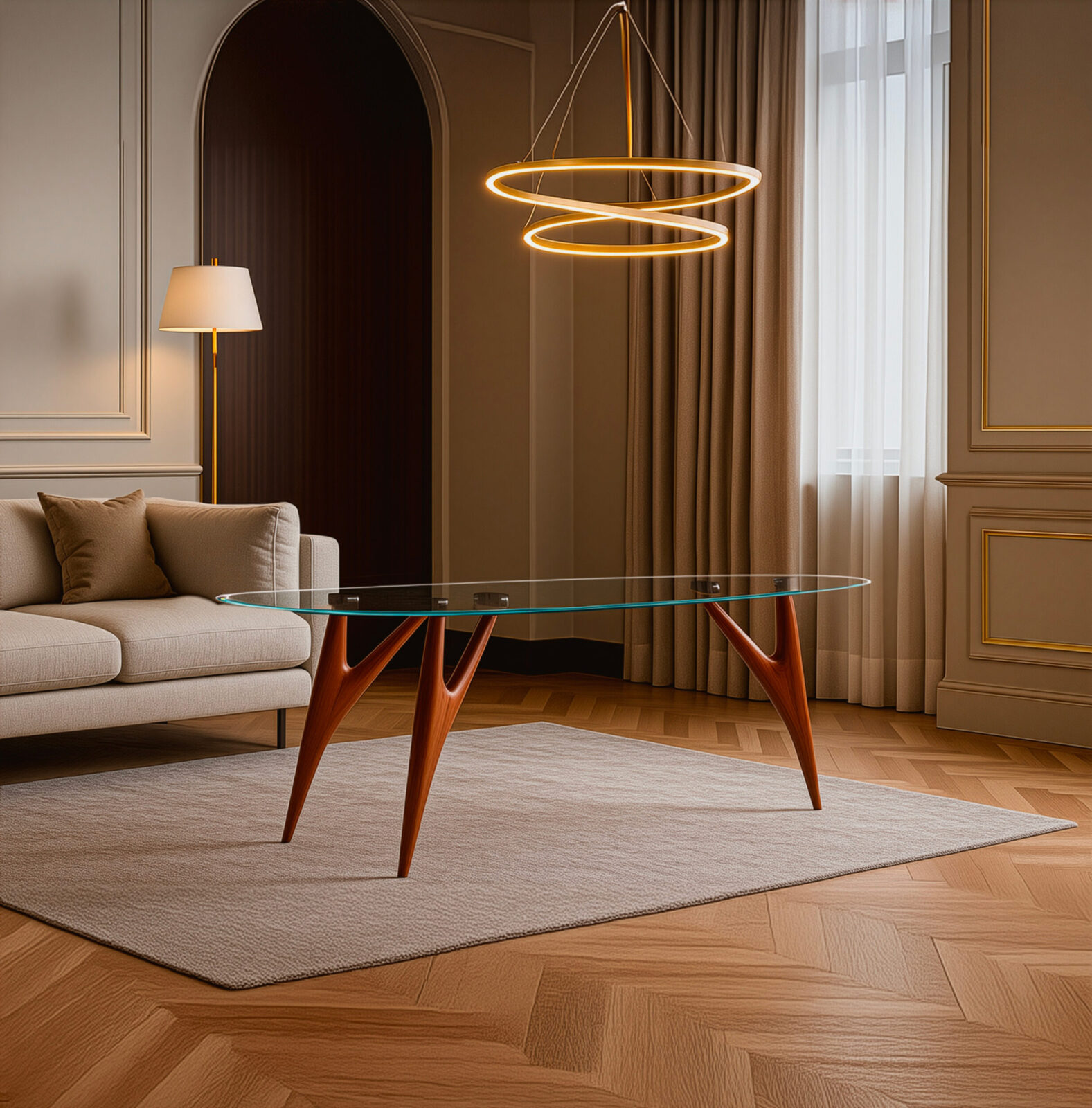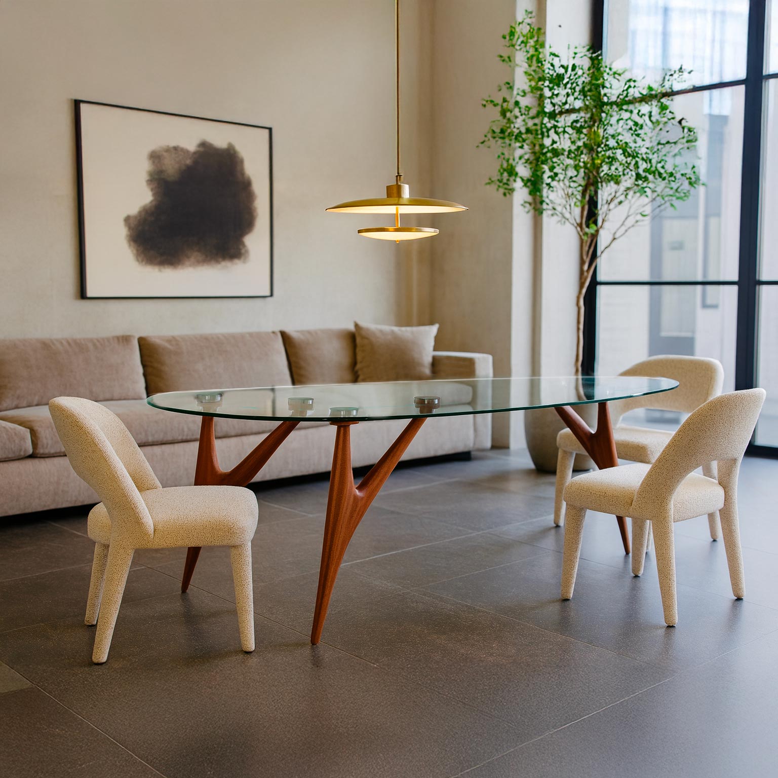 Il Tavolo TED Crystal di Greyge è una perfetta fusione tra leggerezza e materia. Il piano in vetro temperato, trasparente e luminoso, si appoggia su una base in legno massello scolpita a mano, creando un equilibrio armonioso tra solidità e trasparenza.