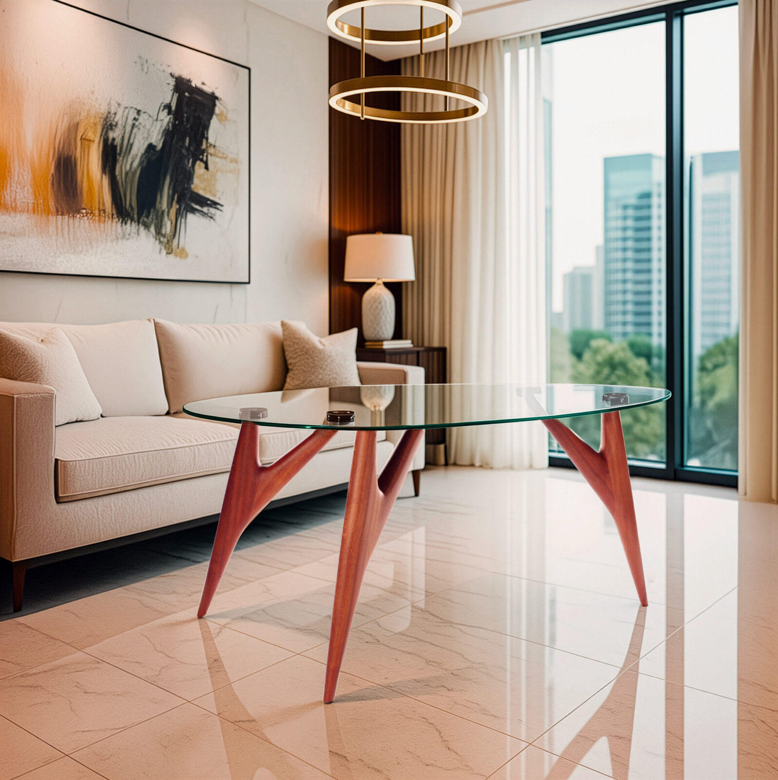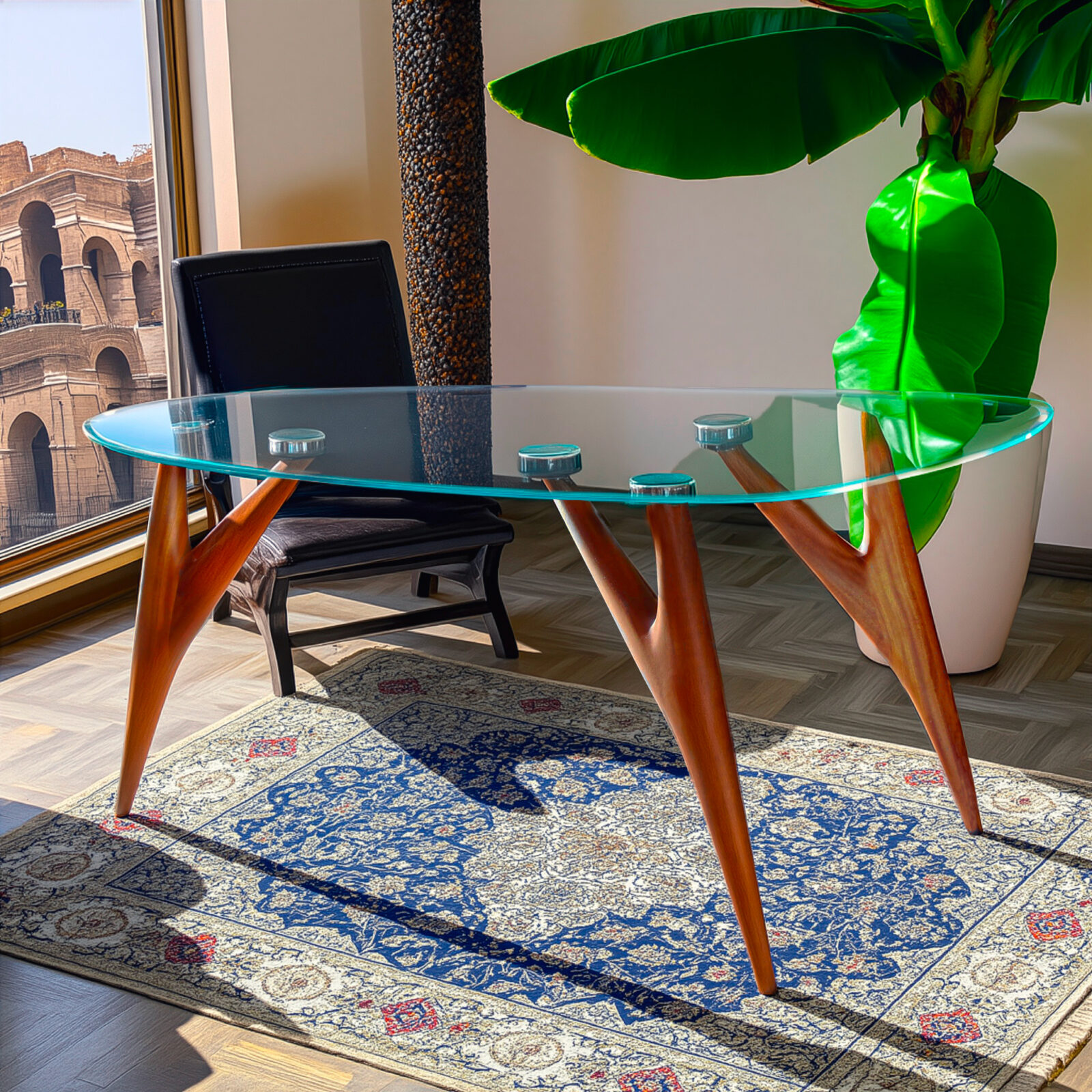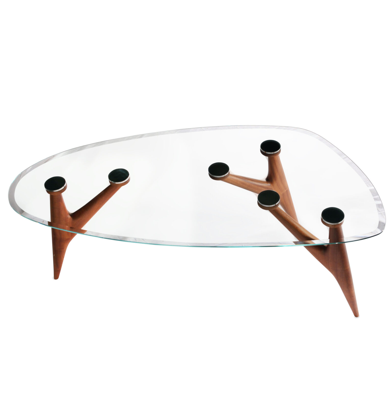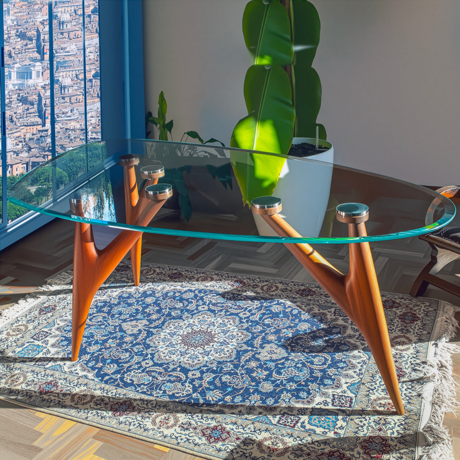 Materiale: Piano in vetro temperato e base in legno massello, scolpita a mano e disponibile in diverse essenze.